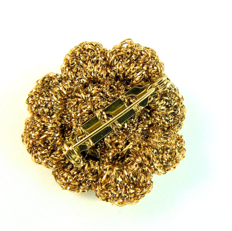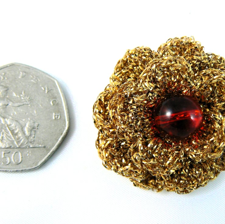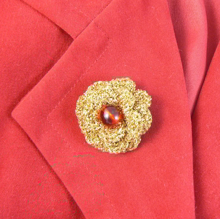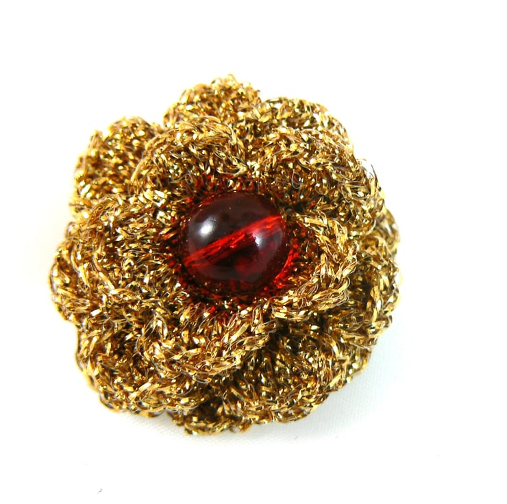 This flower brooch has been crocheted in a gold coloured metallic thread and has a red glass bead in the centre. The glass bead reflects the gold yarn as it catches the light.