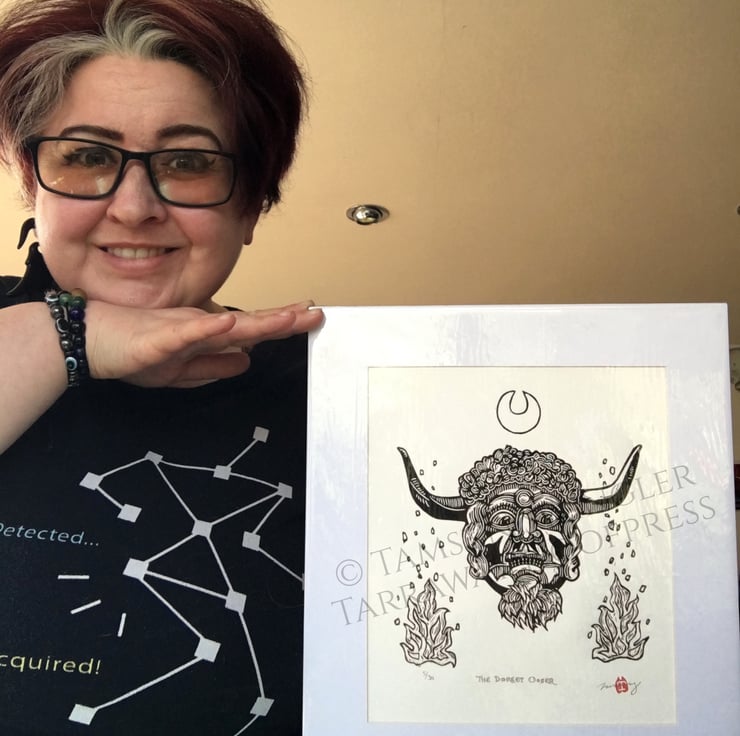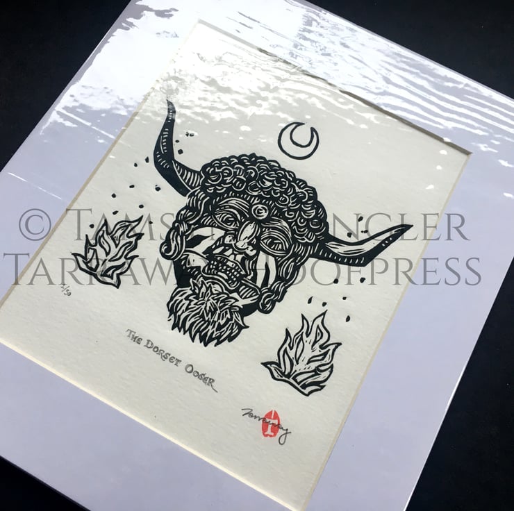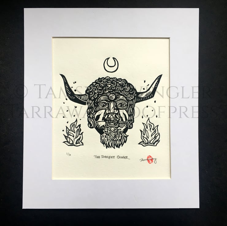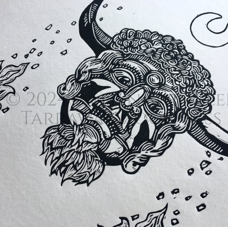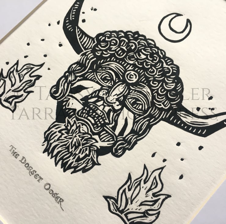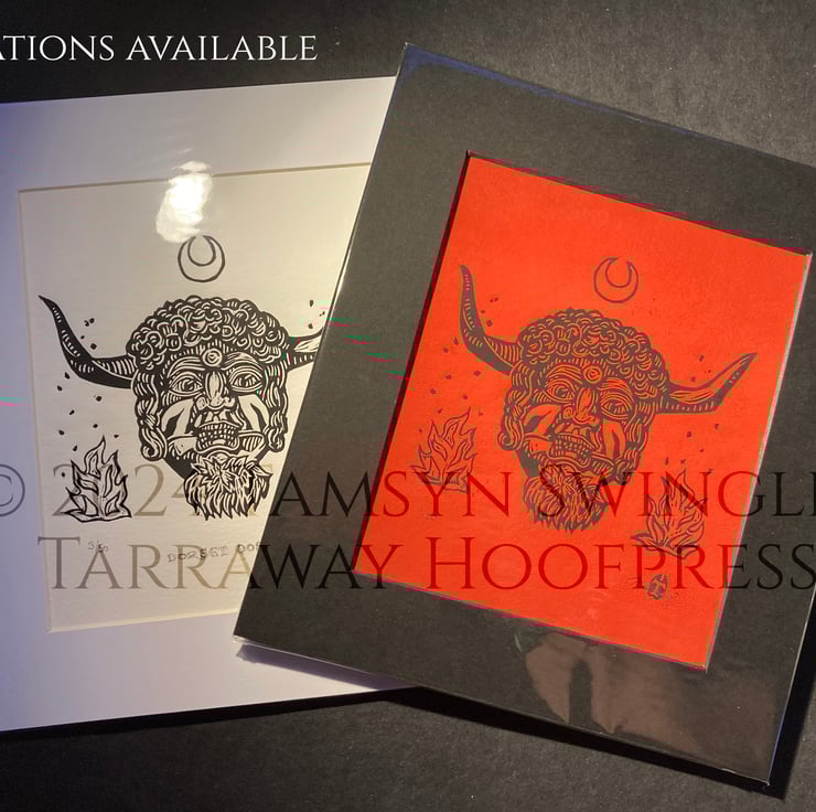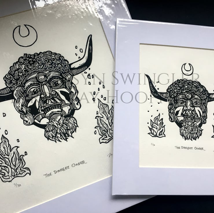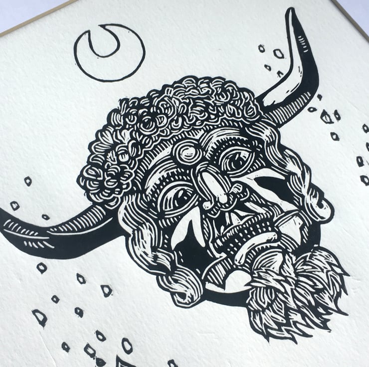 Curious about the enigmatic horned face on the front of the Reader's Digest Folklore, Myths and Legends of Britain book, I wanted to create a print for fellow lovers of Folkloric characters and stories, especially seeing as the original mask (photos of which I used as reference rather than the illustration) is lost to time. Reading up about it I found out it was likely used in charivari processions, also known as a Skimmington ride, where a scandal was performed in mock serenade to shame the culprits.