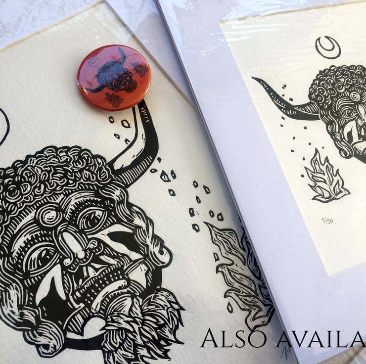 Water-based black matte ink print on white acid free 220gsm cartridge paper, hand-hand pressed with a spoon and touched up by hand also to give it a consistent tone all over. Choose which size option you would like from the drop down menu.