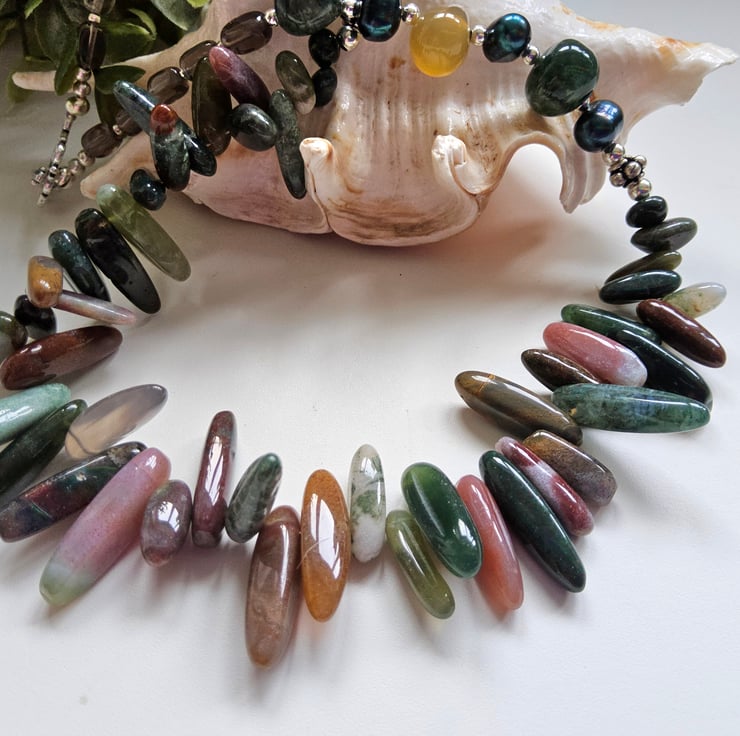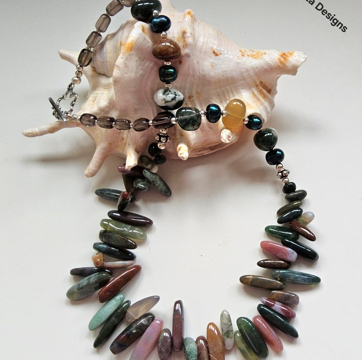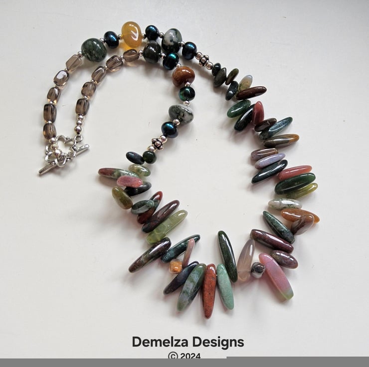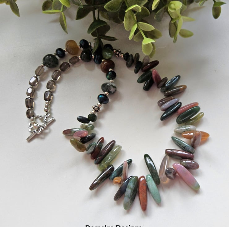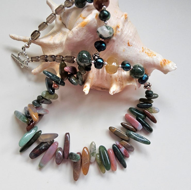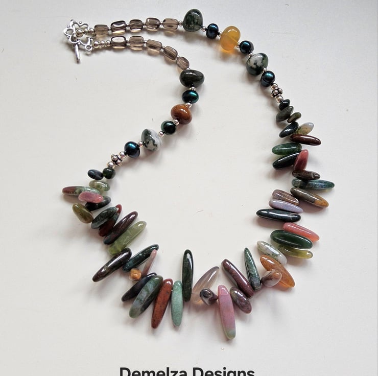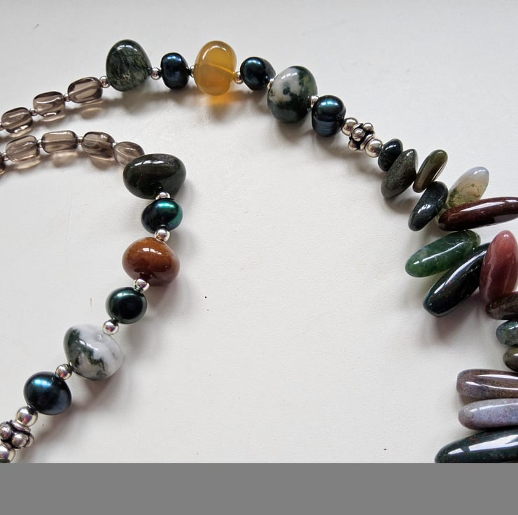 It has long tooth cut fancy jasper gemstones of veriuse sizes compliment with 9mm by 6mm (approximately) bottle green high quality potato freshwater pearls and irregular tumbled pebble cut smooth fancy jasper gemstone beads. Between them are 2.5mm rondelle silver plated spacer beads adding a touch of opulence and sparkle. Following on are 7mm by 4mm irregular cut smooth rectangular smokey quartz gemstones beads on either side.