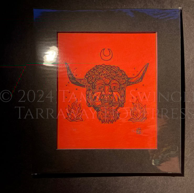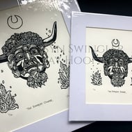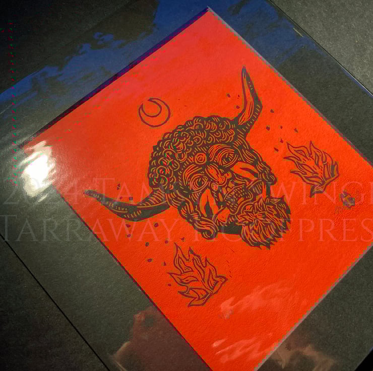 Curious about the enigmatic horned face on the front of the Reader's Digest Folklore, Myths and Legends of Britain book, I wanted to create a print for fellow lovers of Folkloric characters and stories, especially seeing as the original mask (photos of which I used as reference rather than the illustration) is lost to time. Reading up about it I found out it was likely used in charivari processions, also known as a Skimmington ride, where a scandal was performed in mock serenade to shame the culprits.