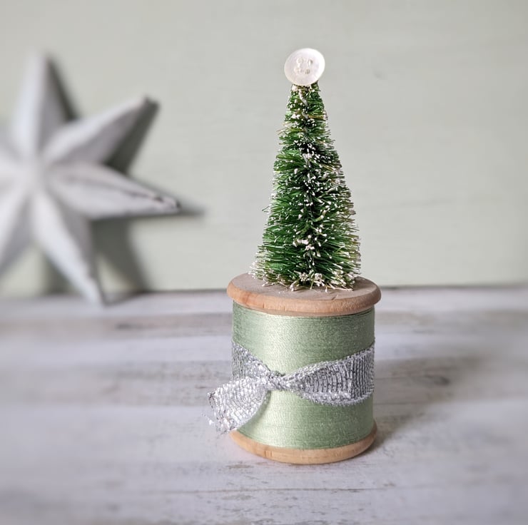 A little Festive tree sits atop a worn vintage wooden bobbin with a teeny mother of pearl button for a star!
