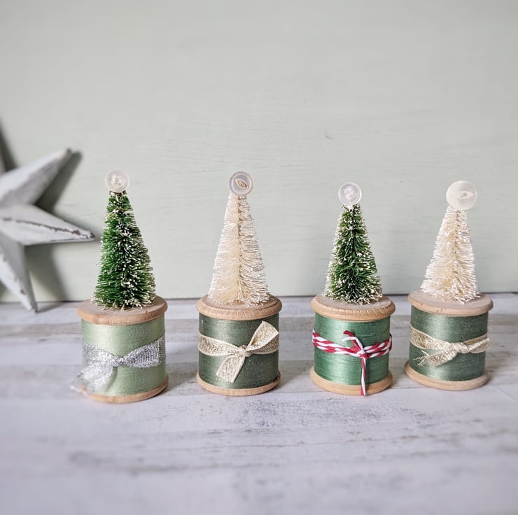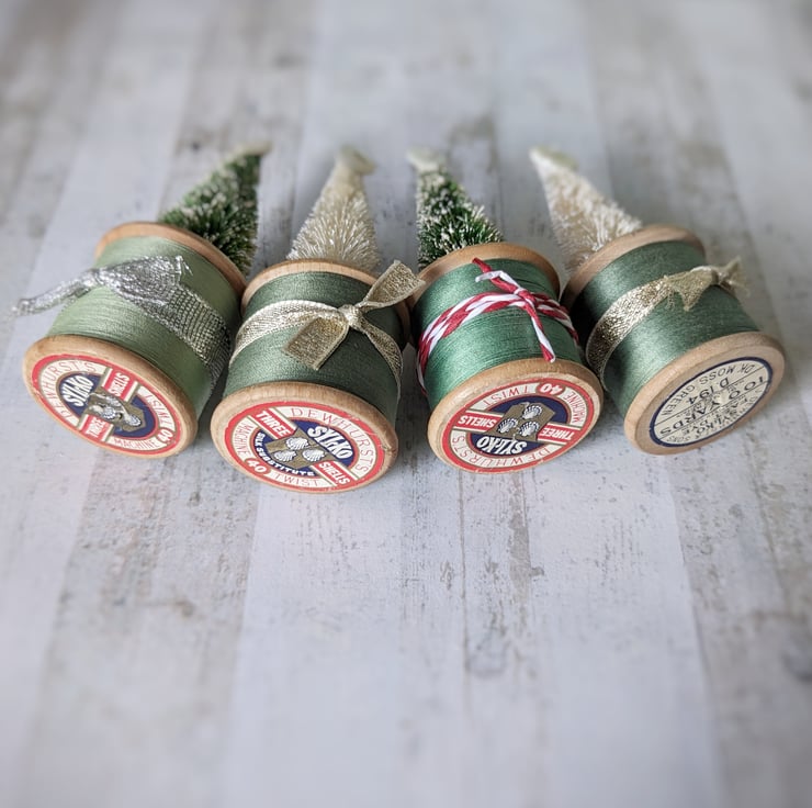 I love to use recycled wooden bobbins and give them a new life... These are so cute and festive for your mantlepiece!