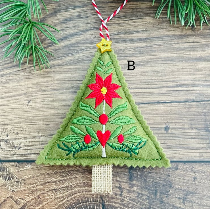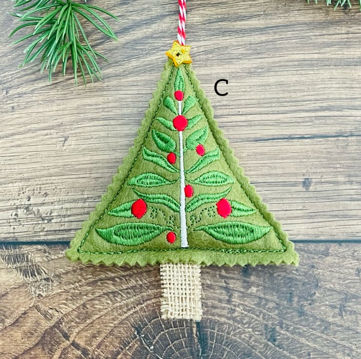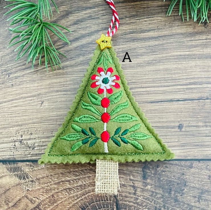 Handcrafted from a wool blend felt and filled with a high-grade hollow fibre polyester. Machine embroidered details to the front and a red & white cord for hanging. Hand finished with a hessian ribbon for trunk and a gold star button to top of tree.
