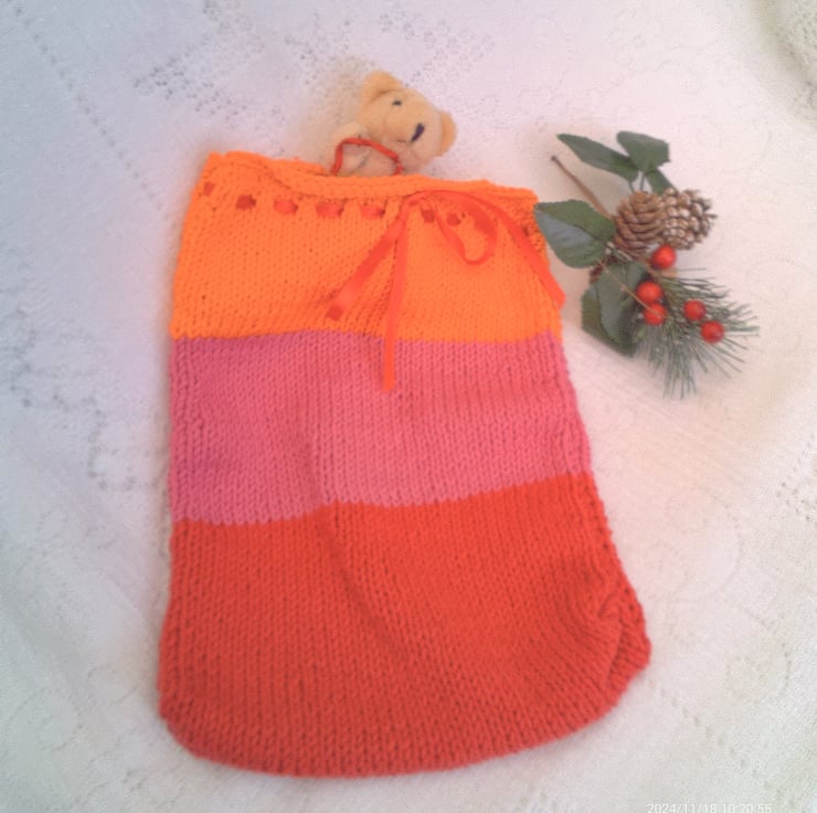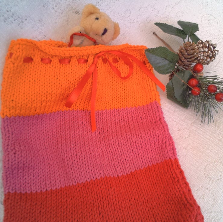 A Large Red, Pink and Orange Knitted Gift Bag, Gift Wrapping, Gift Bags, Gifts, Christmas Gift Wrapping, Colourful Gift Bag