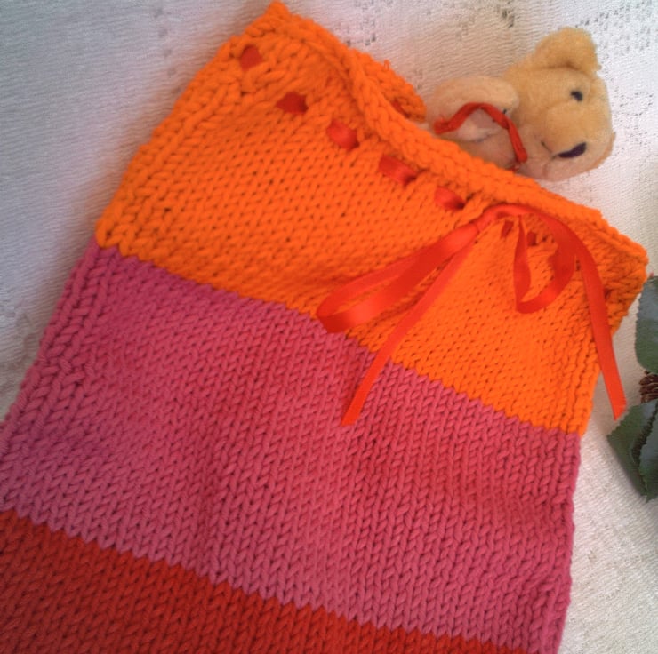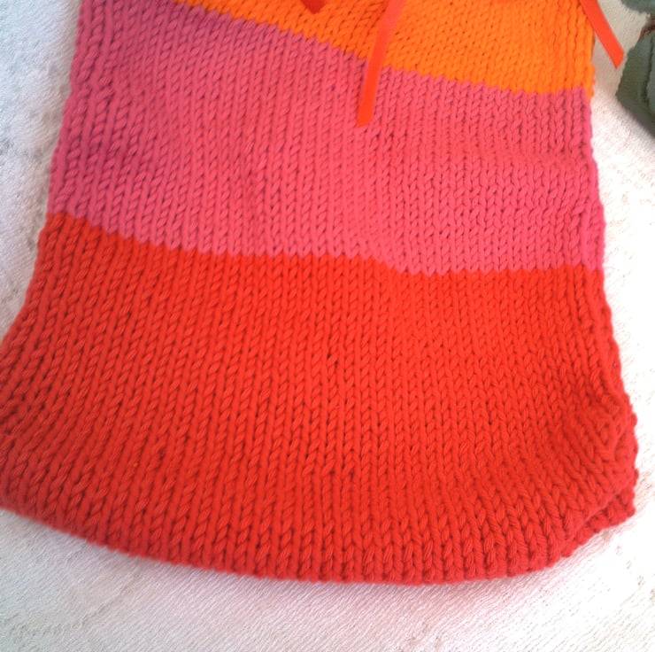 This large colourful gift bag is hand knitted in aran weight cotton yarn, which is soft and springy, and it is secured at the top with matching ribbon. It would make a gift look bright and cheerful and be a change from the usual wrapping paper or paper gift bags. It can be used again and again so are very environmentally friendly.