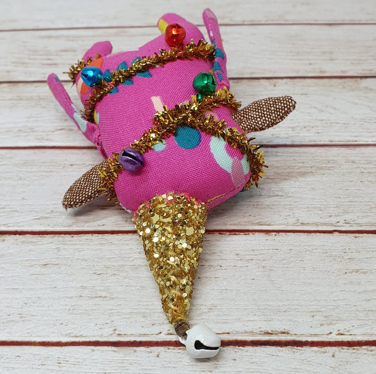 Christmas decorating Brownie in geometric print. Brownie is decorated with tinsel wire and multicoloured miniature bells sewn into place. Brownie wears hand sewn gold glitter hat topped with bell. This little Brownie has hand painted face. Brownie measures roughly 11cm tall.