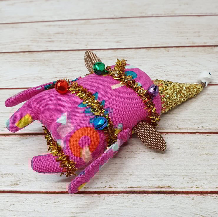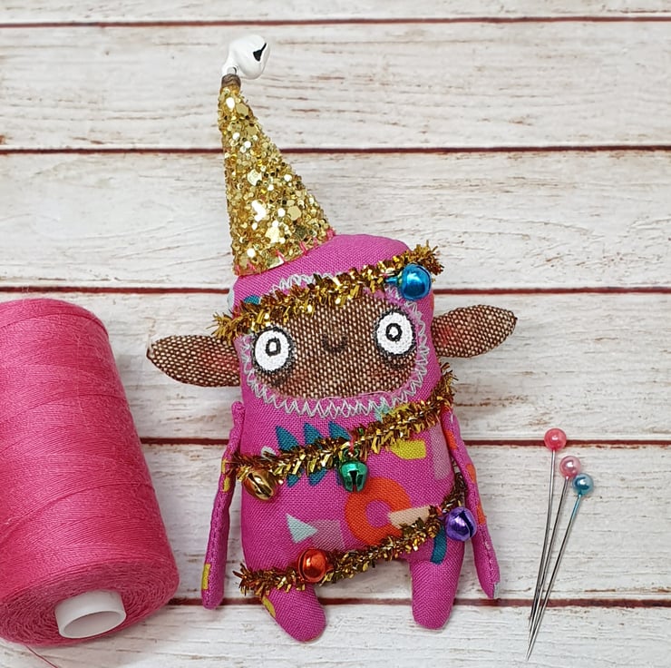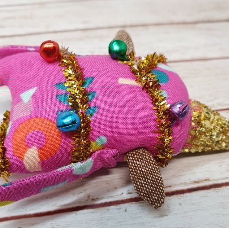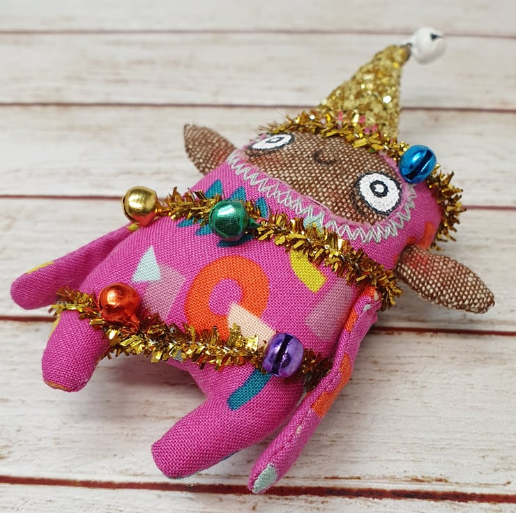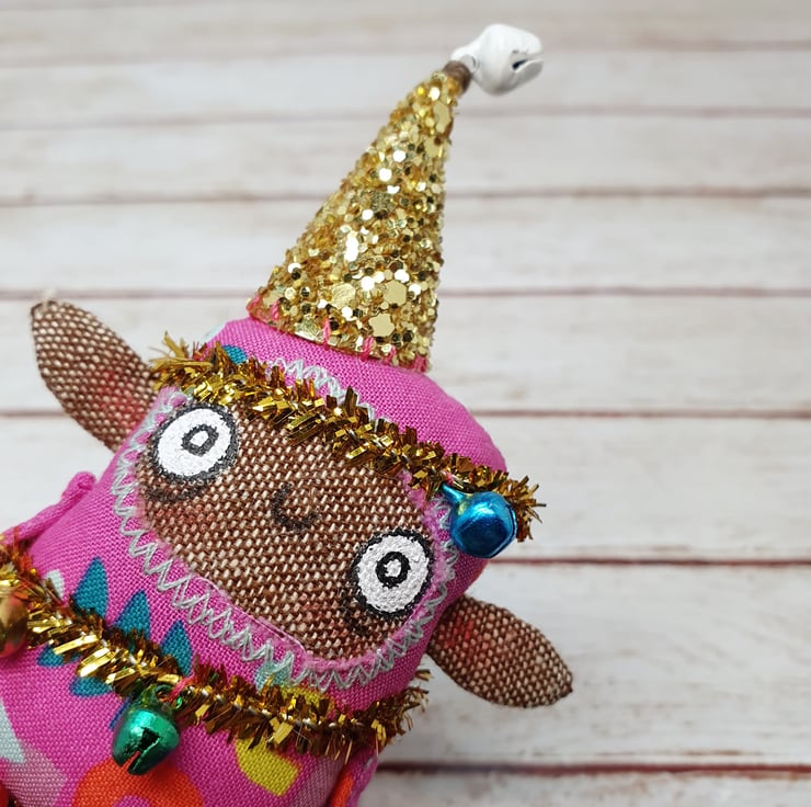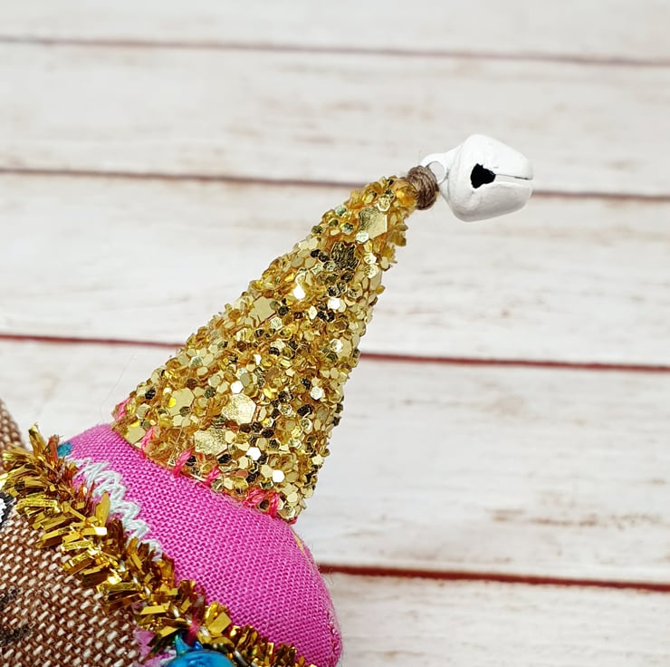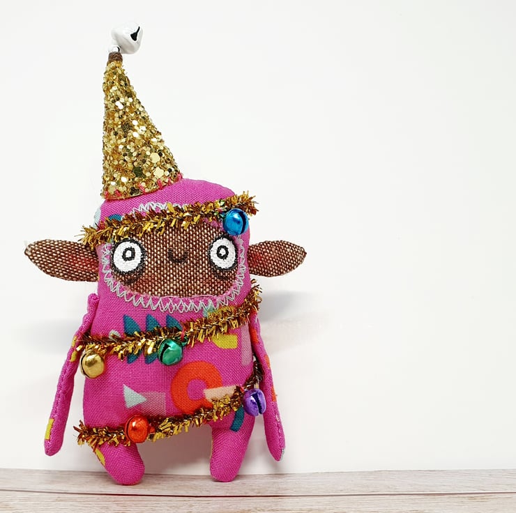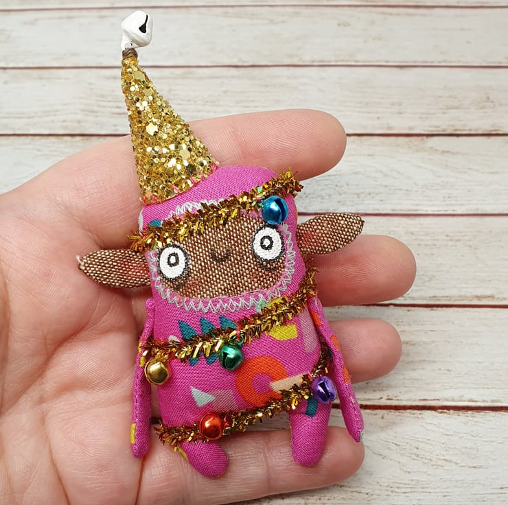 Christmas decorating Brownie in geometric print. Brownie is decorated with tinsel wire and multicoloured miniature bells sewn into place. Brownie wears hand sewn gold glitter hat topped with bell. This little Brownie has hand painted face. Brownie measures roughly 11cm tall.