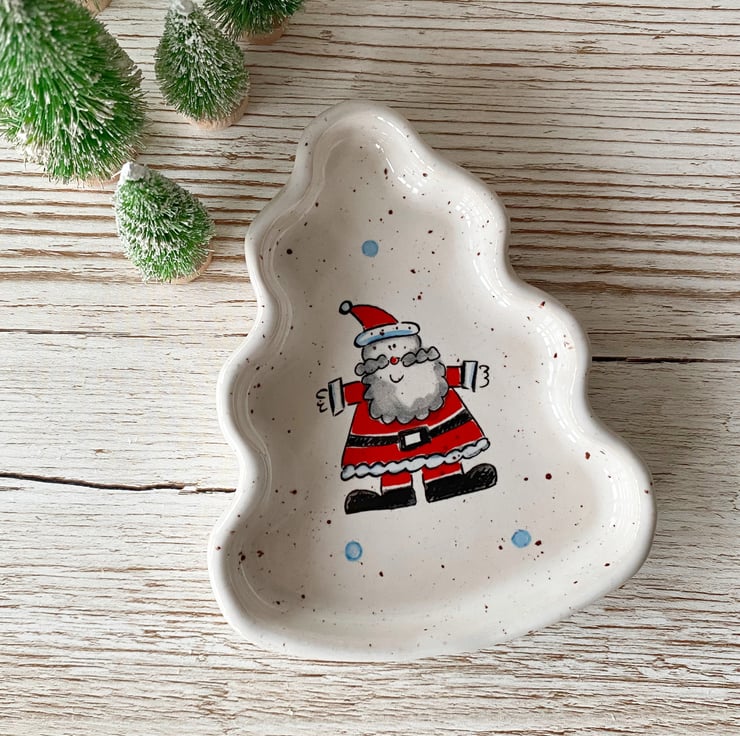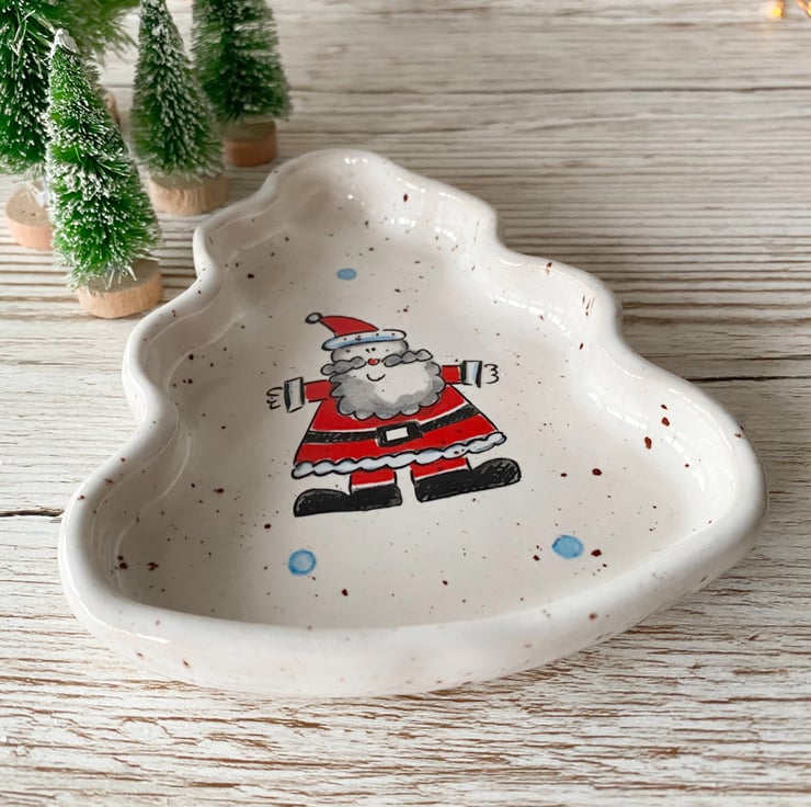 Bring festive cheer to your home with these charming handmade Christmas tree dishes crafted from creamy stoneware. Each piece is carefully shaped, fired, and adorned with a colourful and happy Father Christmas.