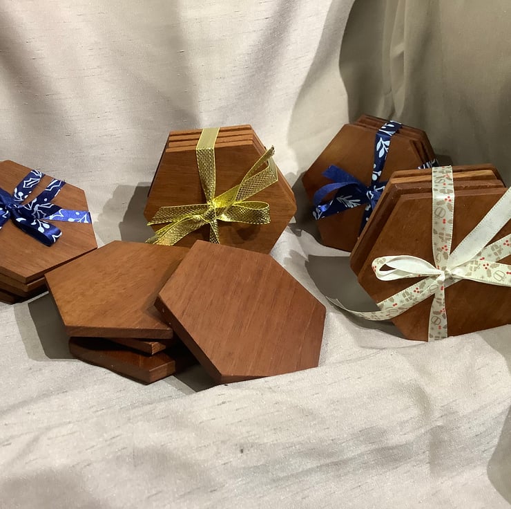 These are beautiful hand made mahogany wooden coasters made from reclaimed wood and finished with natural beeswax. They have felt feet to stop scratching of your surfaces.
