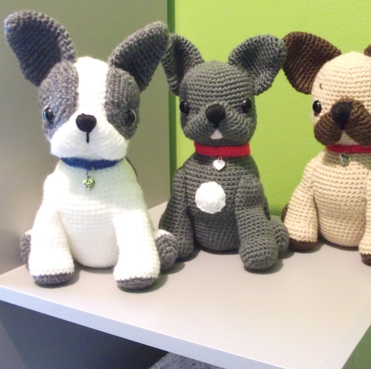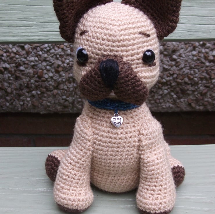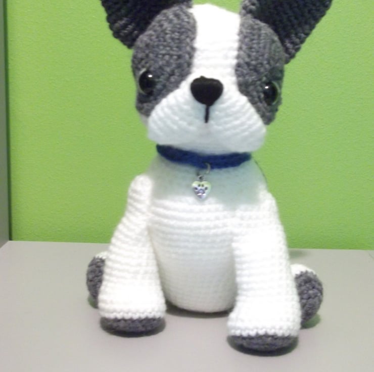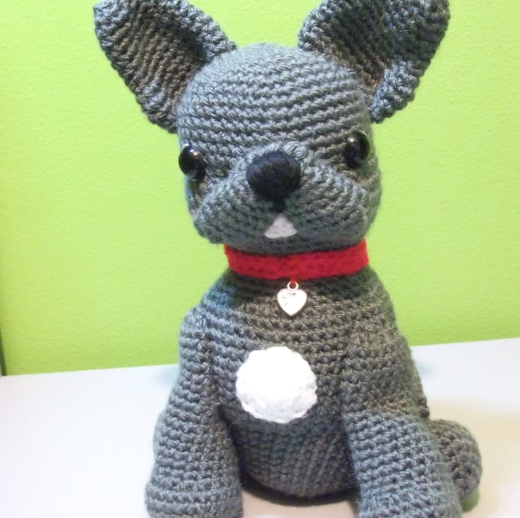 Cute crocheted French Bulldog, handmade from acrylic yarn and stuffed with polyfill.