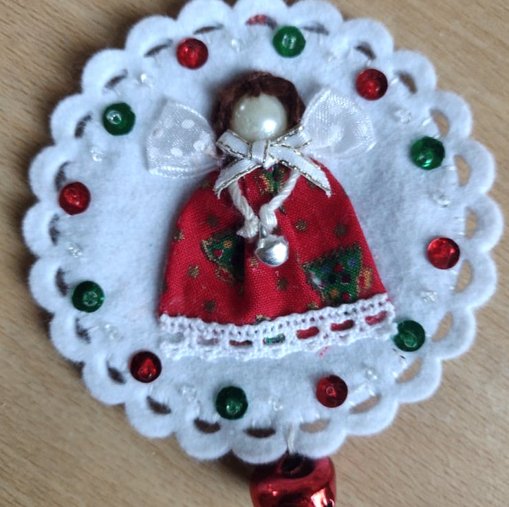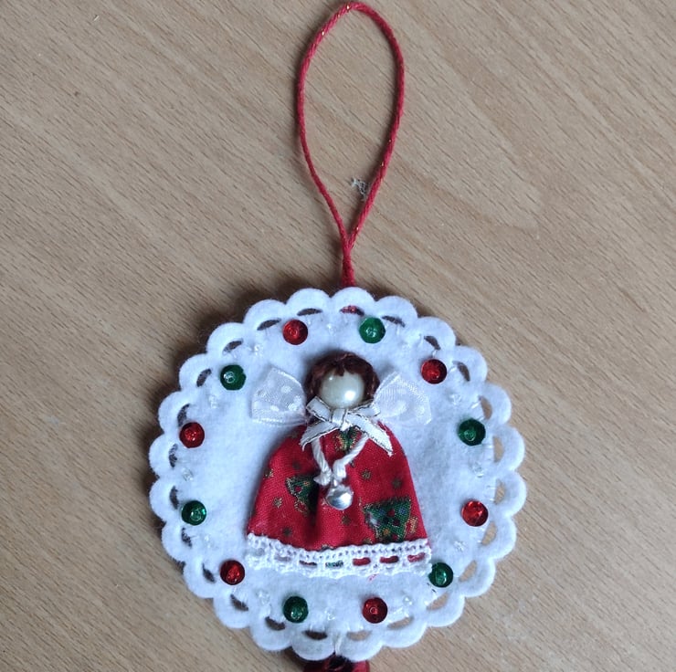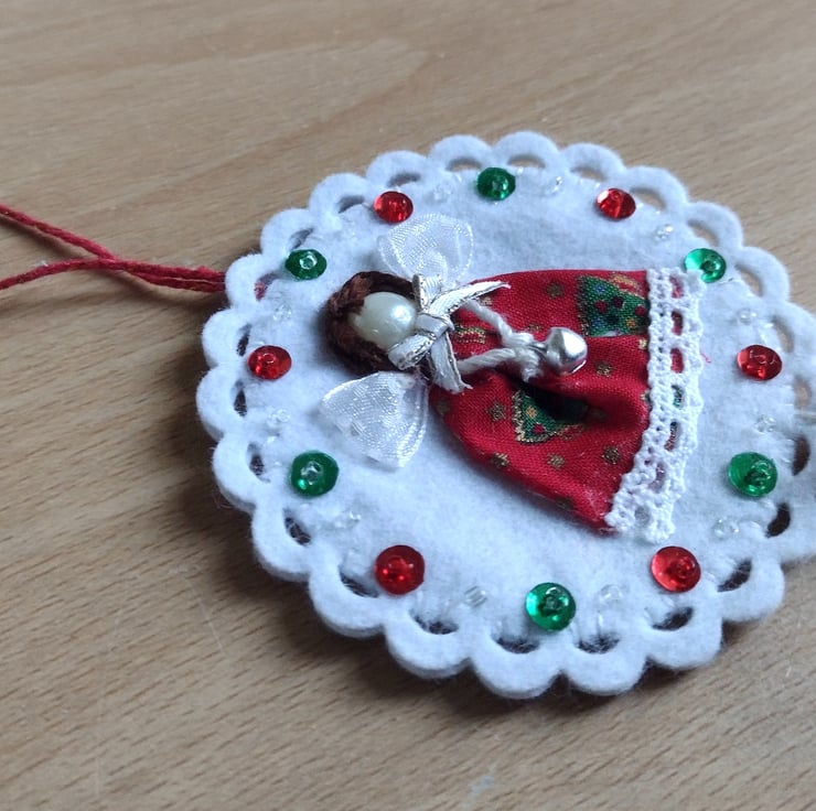White felt circular tree ornament featuring a hand-stitched mini textile angel girl, created from fabric, ribbon and lace pieces, an acrylic pearl gem and embroidery thread.