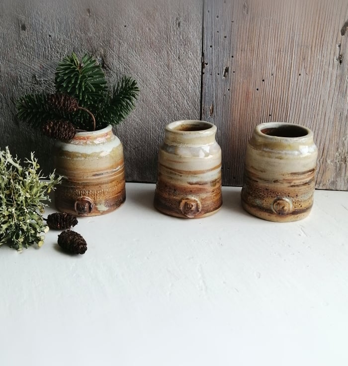 Each one thrown with the same weight of clay, but each one unique, the shapes inspired by a collection of old ceramic and glass ink bottles that I have.
