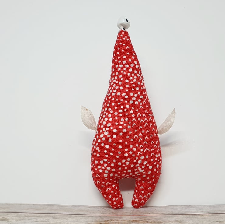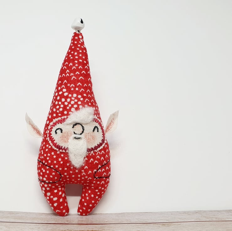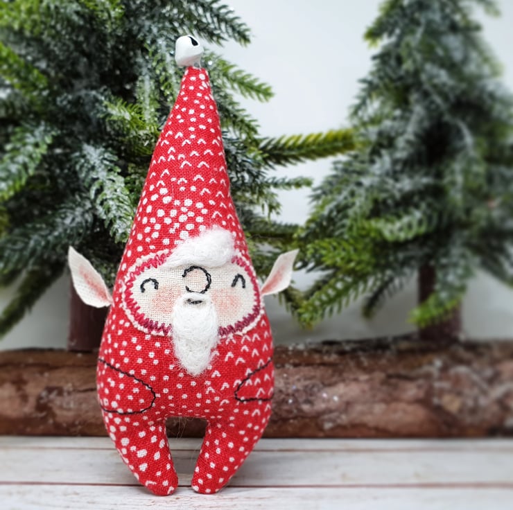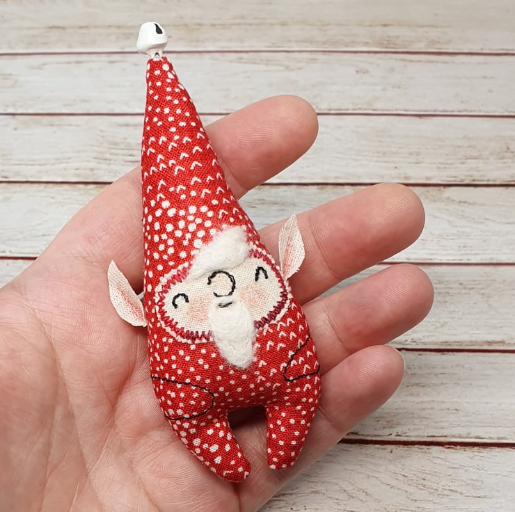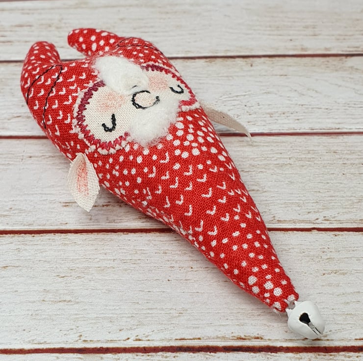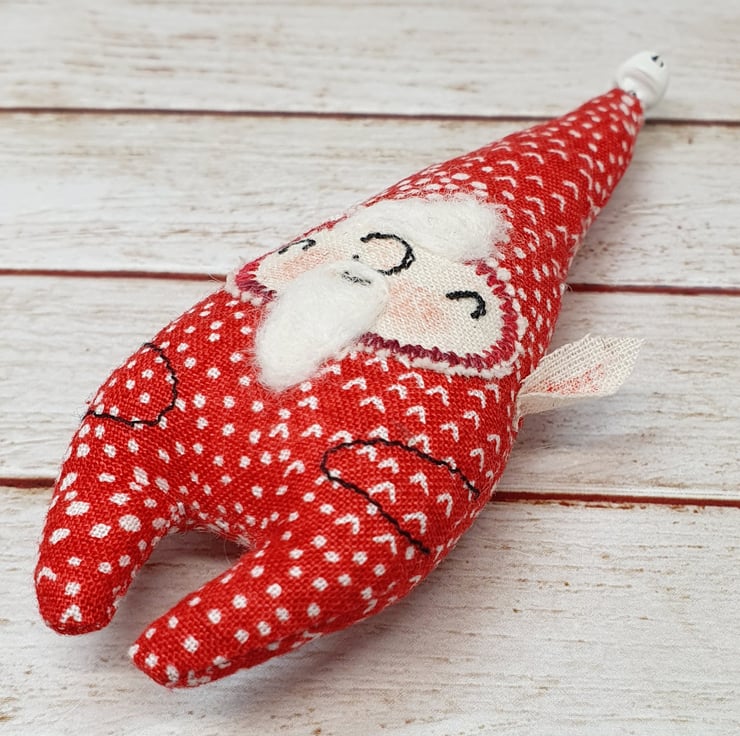 Miniature Santa decoration with free motion embroidered face, waxed rosy cheeks and needlefelted wool beard. Santa is topped with a tiny bell and has free motion embroidered arms. He measures roughly 11cm tall and comes with a transparent loop hanger.