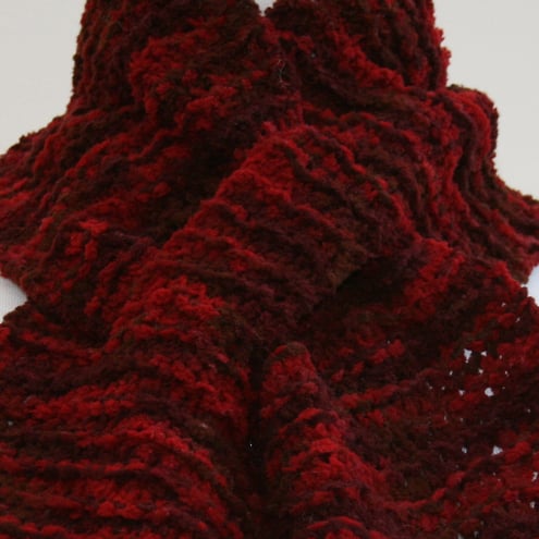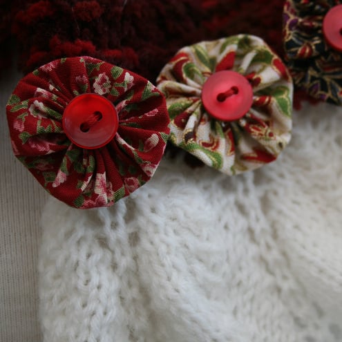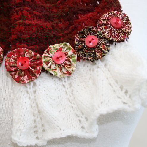 Both ends of the scarf are finished with a ruffle of knitted lace, worked in a 4 ply, pure wool yarn. The top of each ruffle is embellished with four yo-yo flowers in red floral fabrics with button centres. The scarf is worn by threading the opposite end through the keyhole slots.