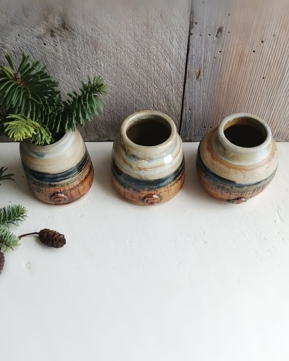 Each one thrown with the same weight of clay, but each one unique, the shapes inspired by a collection of old ceramic and glass ink bottles that I have.
