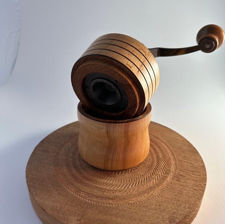 Antique style Coffee Grinder with a box to catch the grinds until you need to use them. The size of the grinds is controlled by the position of the screw below the crank handle. This is made from Beech.