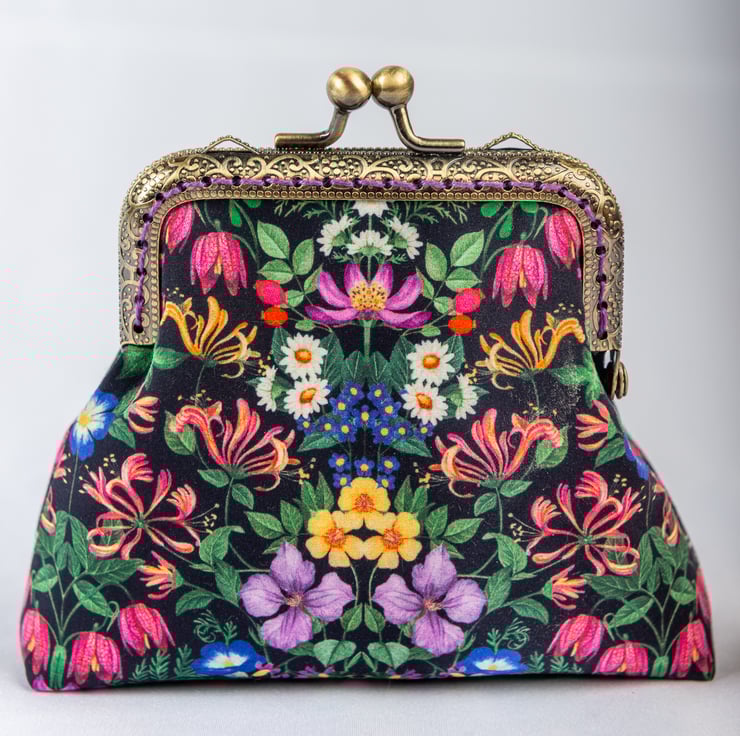 The engraved metal frame of the purse is a bronze colour and I've hand stitched it into place using a toning perle cotton in a toning shade.