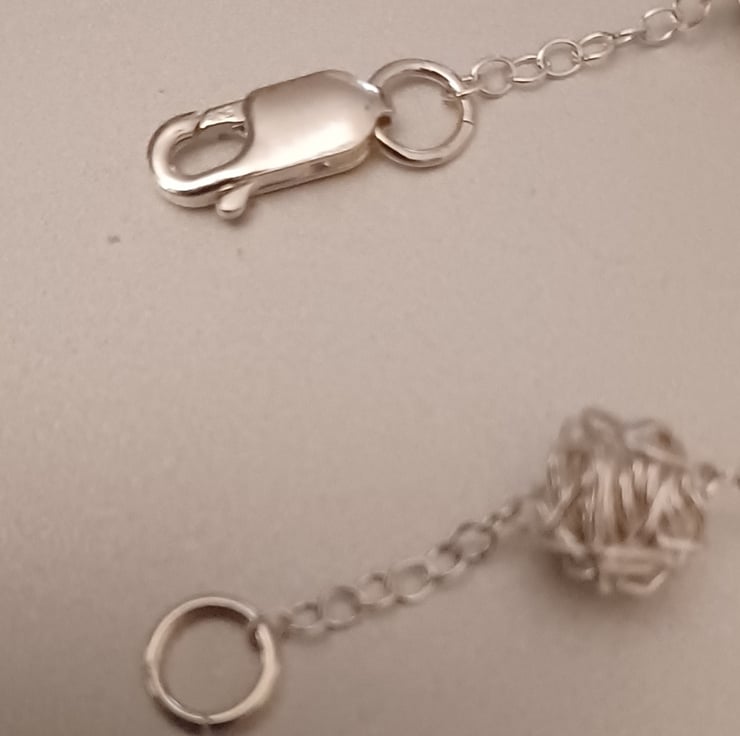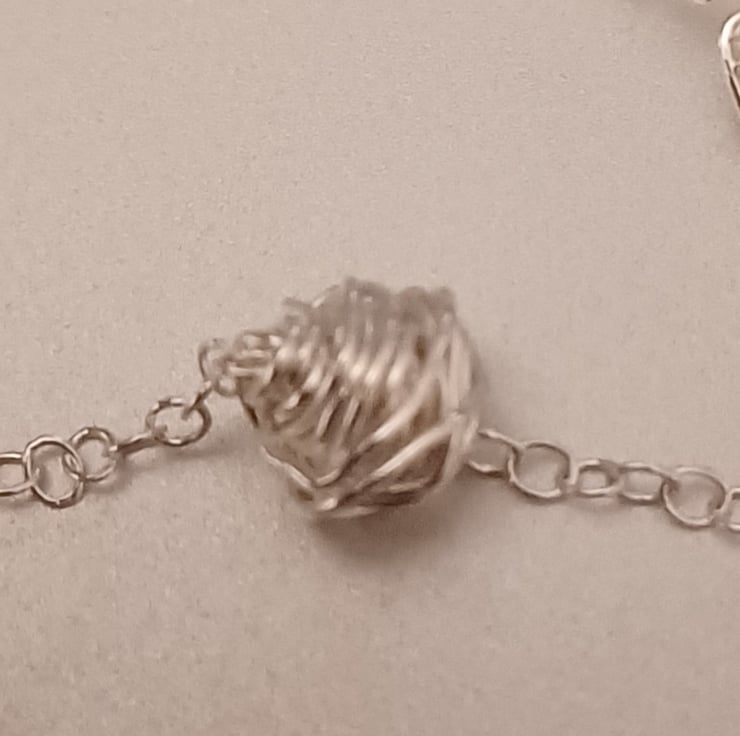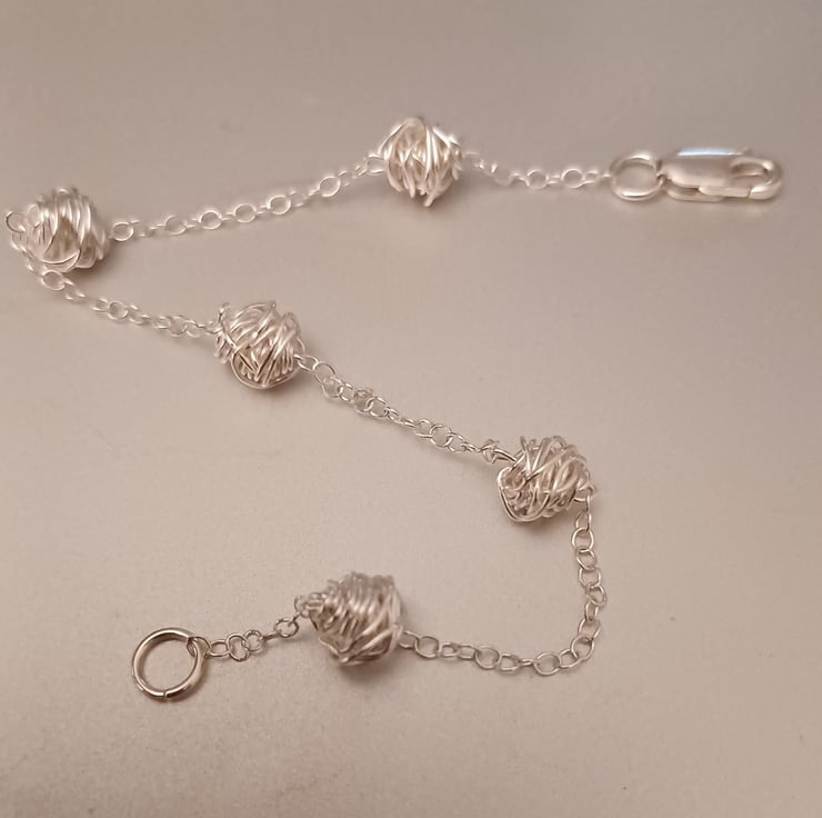 A pretty sterling silver bracelet made from handmade silver scribble beads threaded onto a fine sterling silver chain. The bracelet is 19cm (7.5") in length and finished with a lobster clasp. There are 5 scribble beads each about 6mm in diameter.