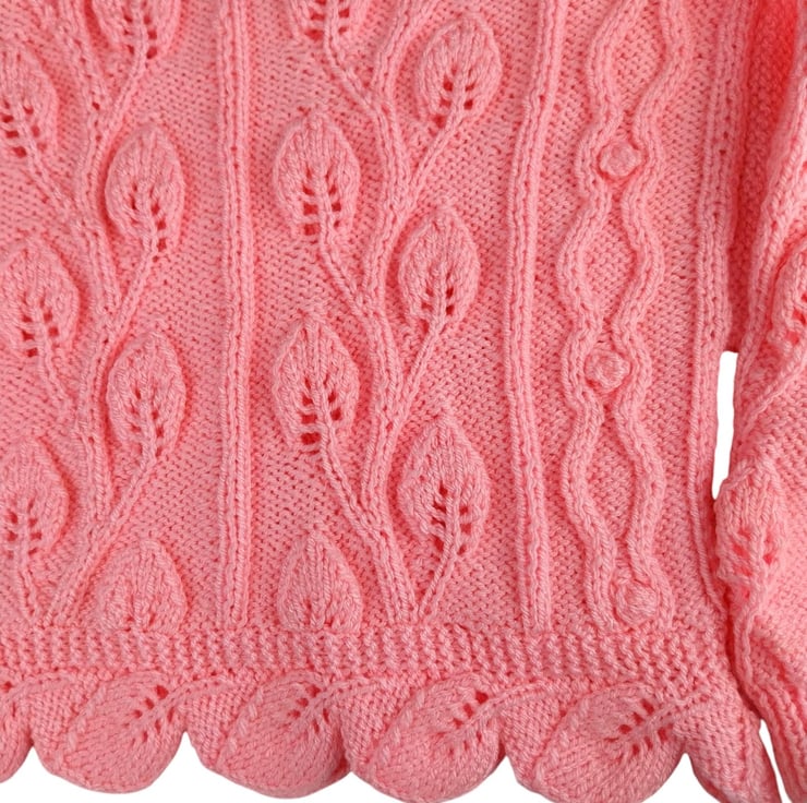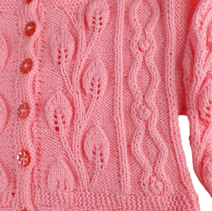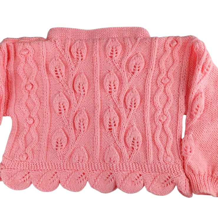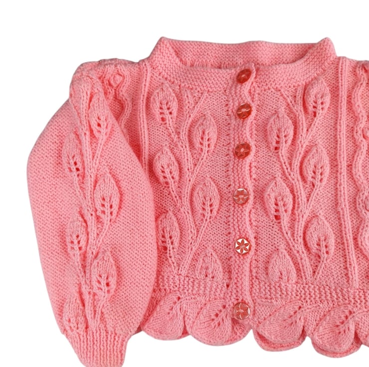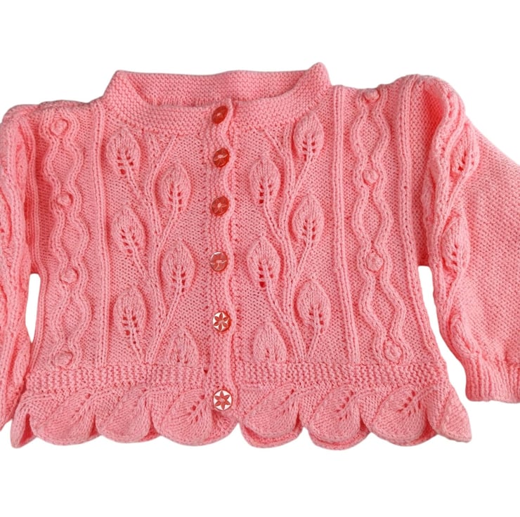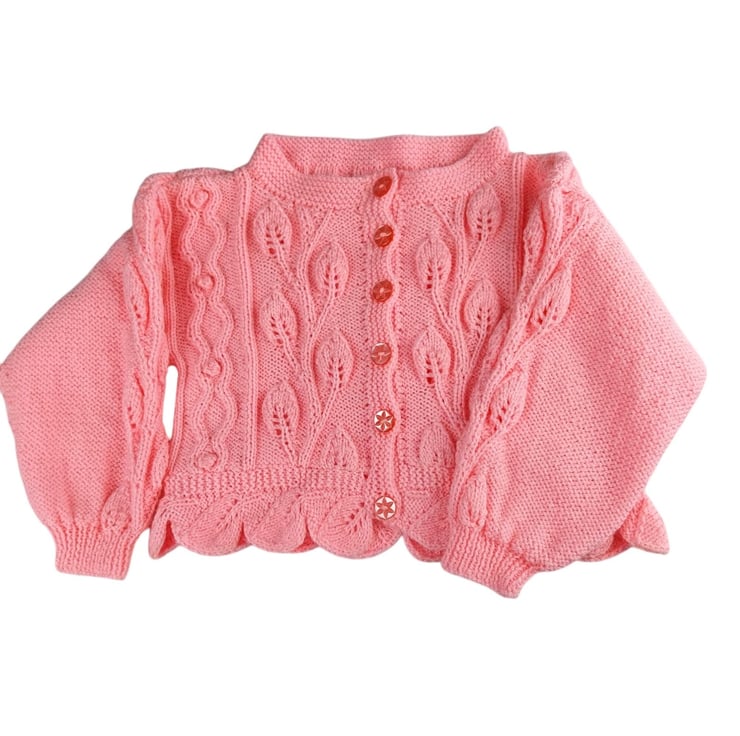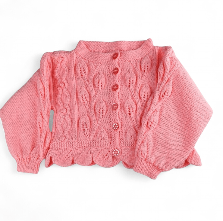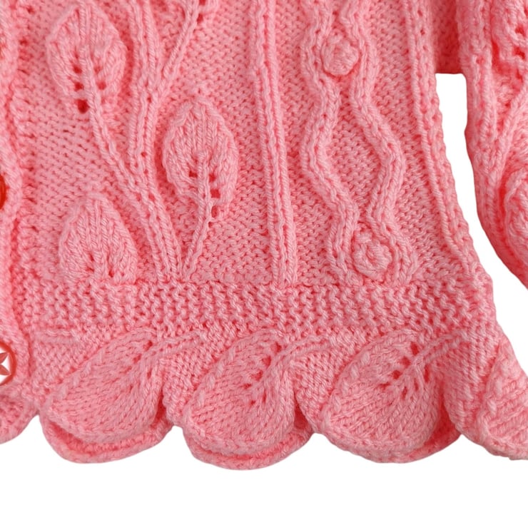 Wrap your little one in this adorable, hand-knitted pink baby cardigan! Perfectly designed to fit ages 1-2 years, this sweet cardigan features a charming leaf pattern along the front, back and sleeves and a beautiful scalloped leaf edging at the hem. Made with care, it's cosy, soft, and stylish – perfect for keeping your baby warm while looking cute.