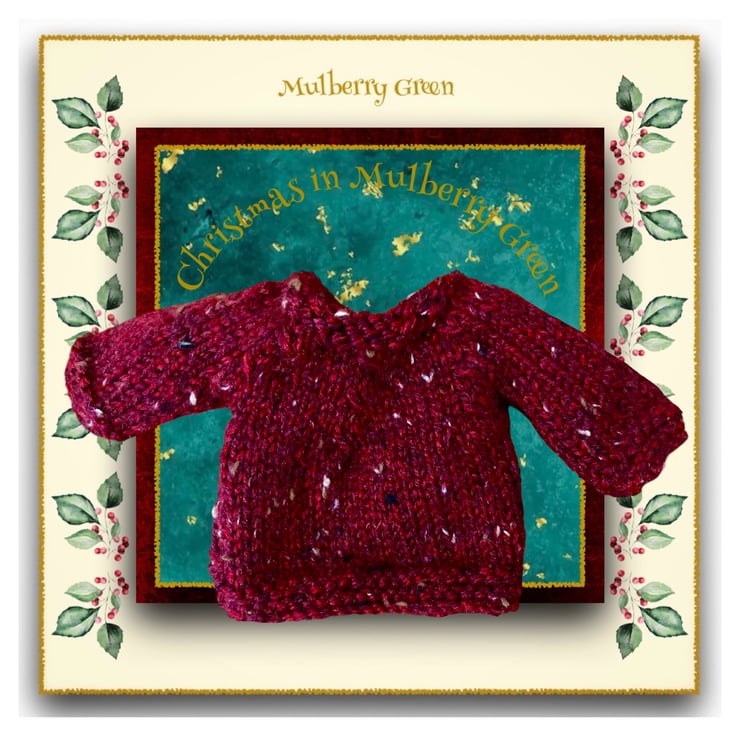 A lovely burgundy tweed jumper, to fit the Mulberry Green characters. The jumper is hand knitted and fastens with a little popper at the back.