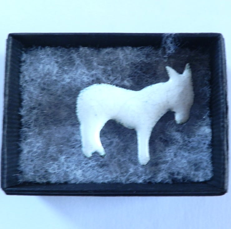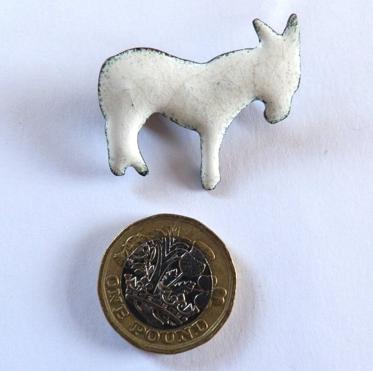 This donkey measures 34mm, nose to tail, 30mm, hoof to ear-tips. It is mounted on a 26mm brooch bar, soldered to the copper base. The pin secures with a rotating catch.