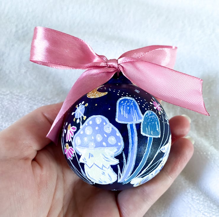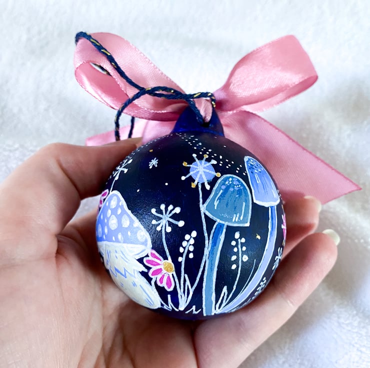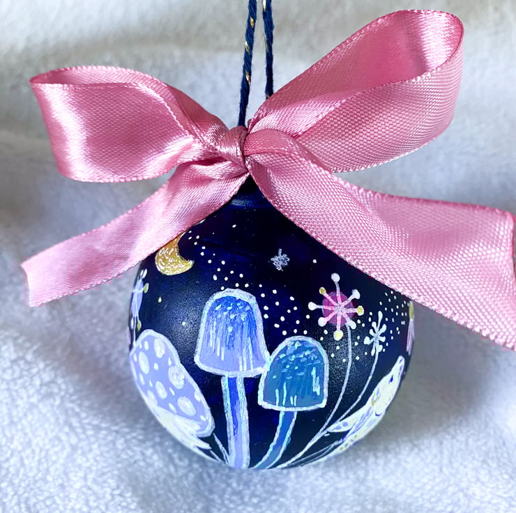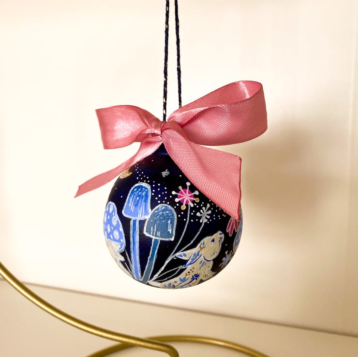 This bauble is part of main collection that is inspired by cottage-core and whimsical aesthetics. Drawing in florals, toadstools and woodland animals. This particular design adds an extra layer of enchantment with embellished bunnies and a magical starry sky.