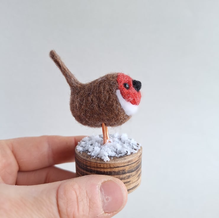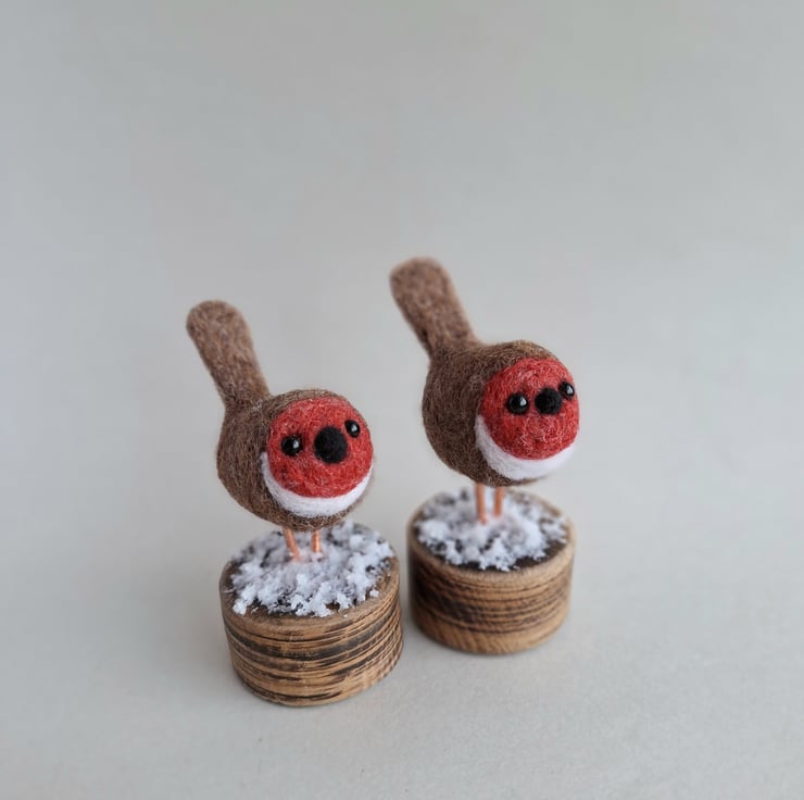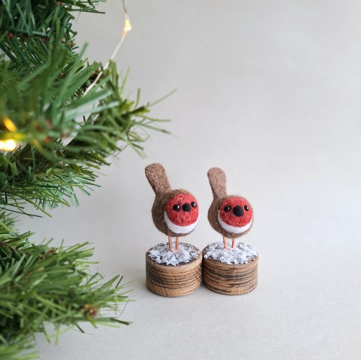 These little Robins are hand felted from soft wool, and mounted on oak whisky cask offcuts.