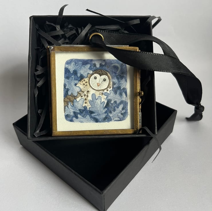In the Blue Oak is a miniature original painting presented in a brass frame and gift boxed. Measures 5cm square.