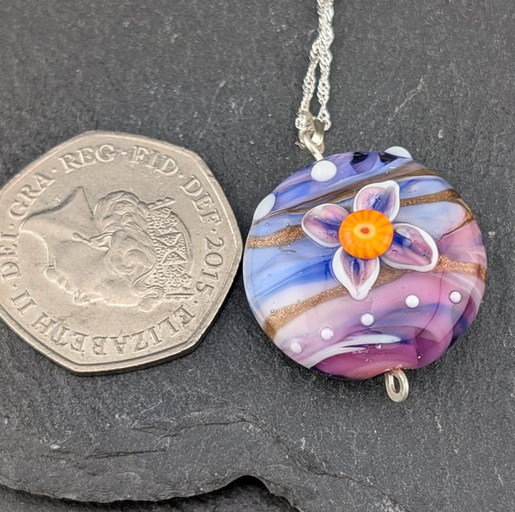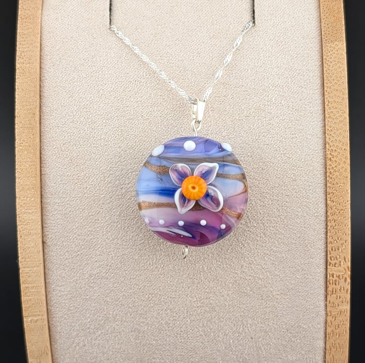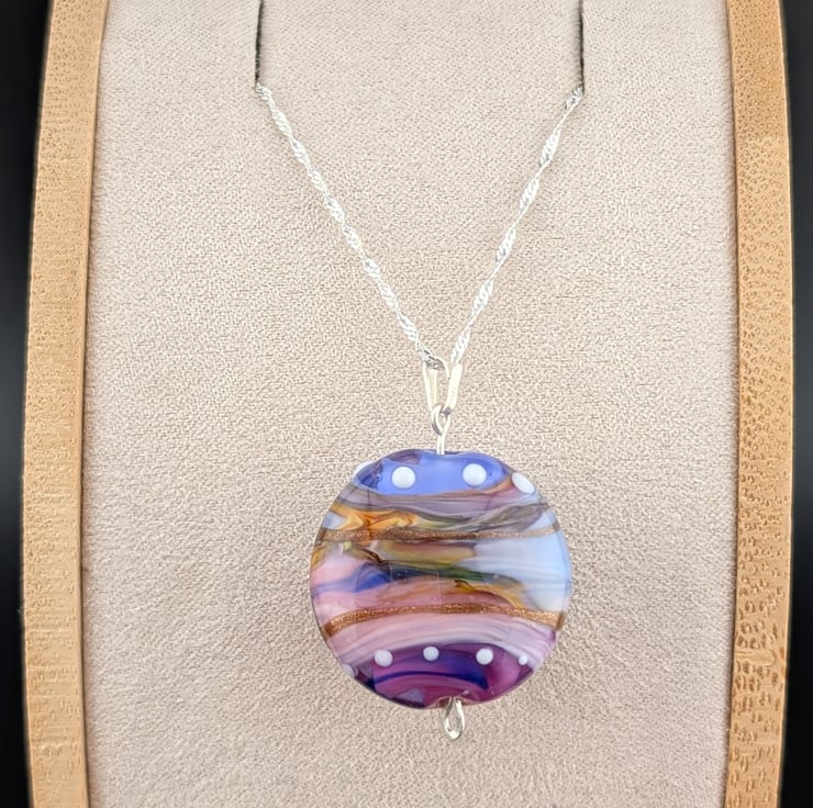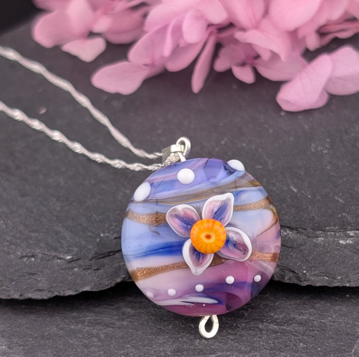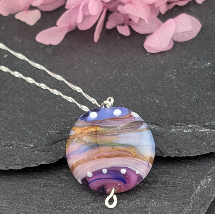 A bespoke lampwork pendant that is rich in pink, purple and blue hues with goldstone detailing. The lampwork bead starts life as simple glass rods that I melt in the flame and onto mandrels. I then add layers of glass and continue to melt and shape in the flame.