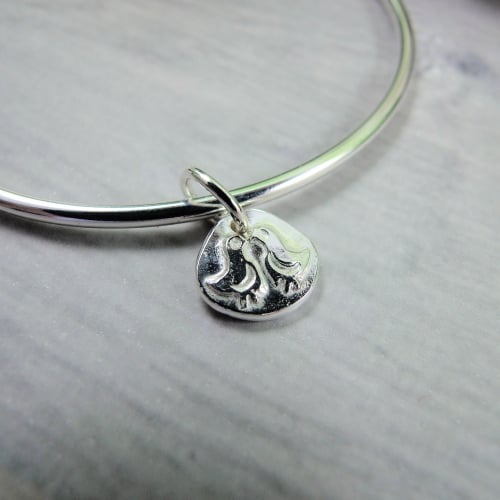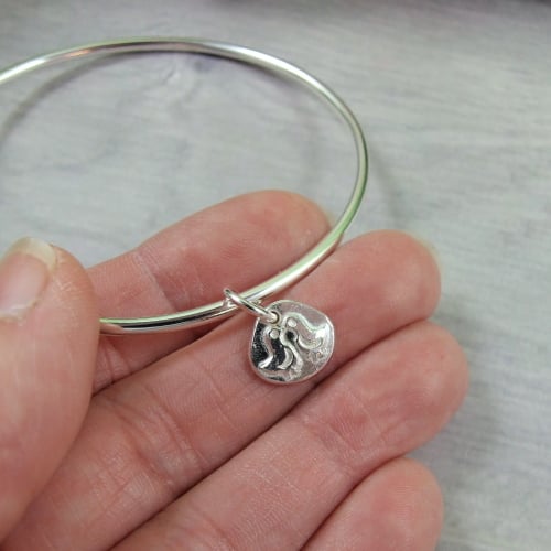 I have made the bangle from 2.5mm wide solid recycled sterling silver wire which I have soldered shaped into a bangle. The charm is made from recycled silver that I have heated to melting point and them hammered into a steel mould to create the love birds impression. The charm has also been soldered onto the bangle .