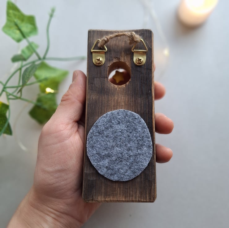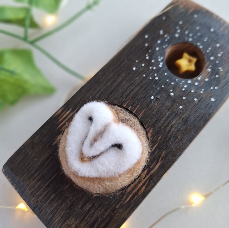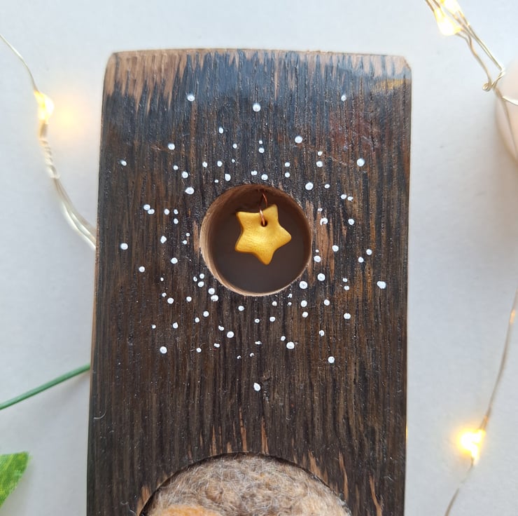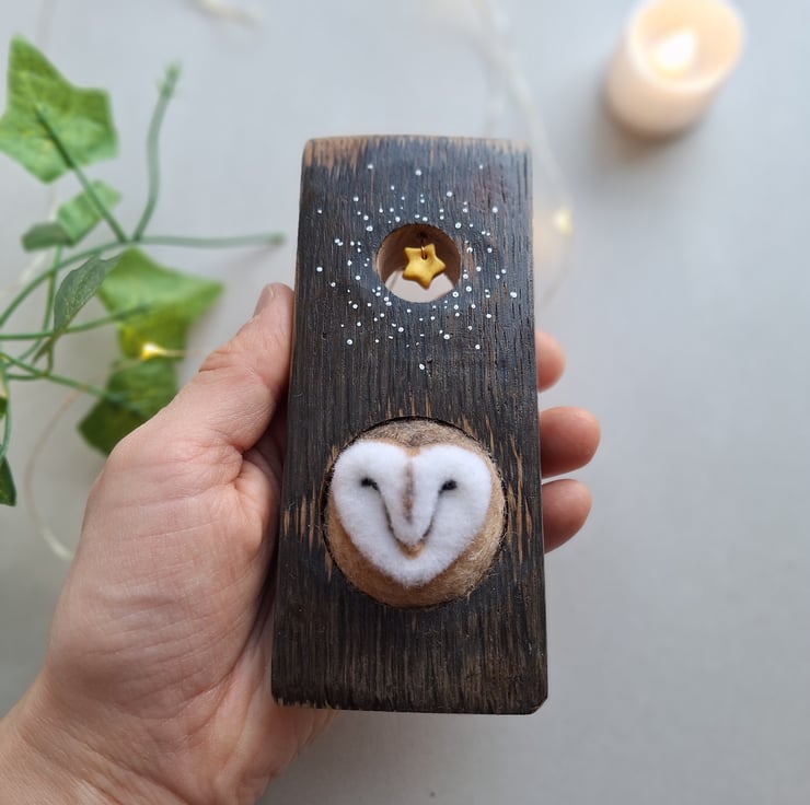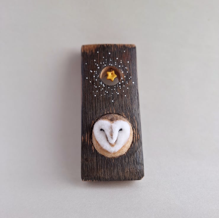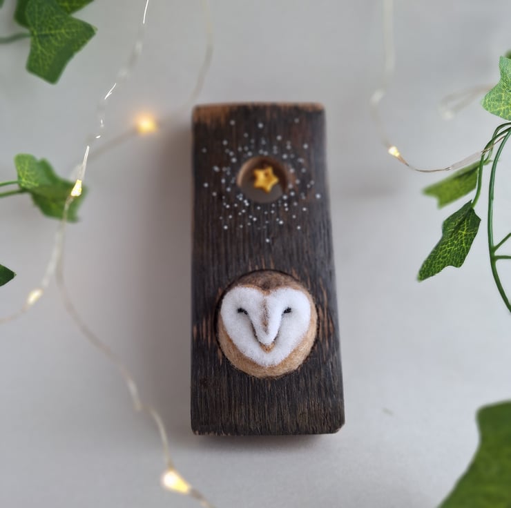 Hand felted from soft wool, these Barn Owls are mounted in upcycled whisky cask staves from a local distillery. Tiny polymer clay stars are suspended in a hole above the owl, with hand painted details adorning the wood. Every piece is sealed with varnish to protect the paint work.