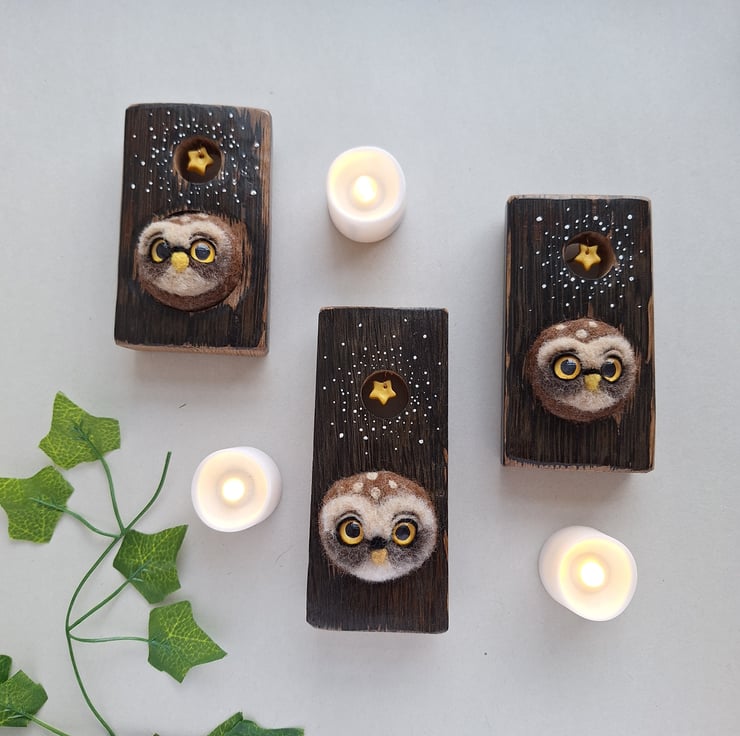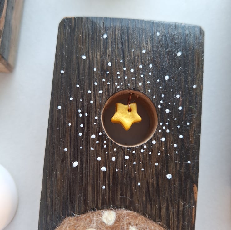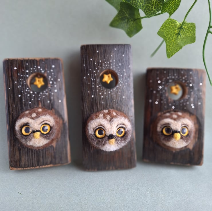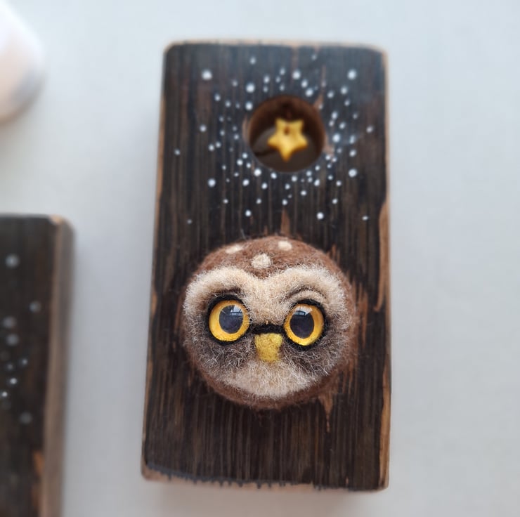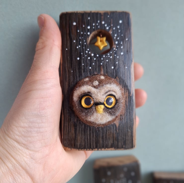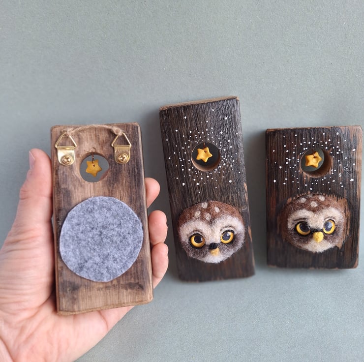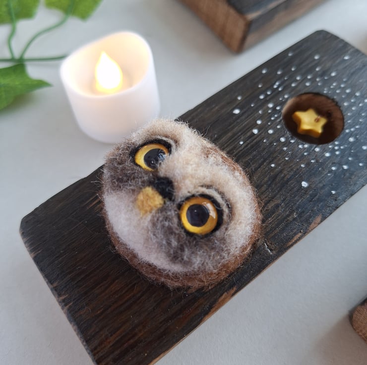Hand felted from soft wool, these Screech Owls are mounted in upcycled whisky cask staves from a local distillery. Tiny polymer clay stars are suspended in a hole above the owl, with hand painted details adorning the wood. Every piece is sealed with varnish to protect the paint work.