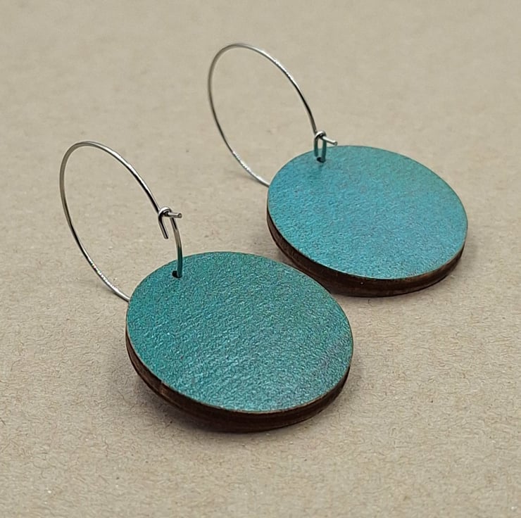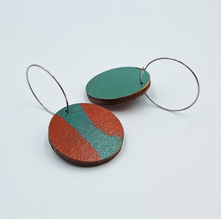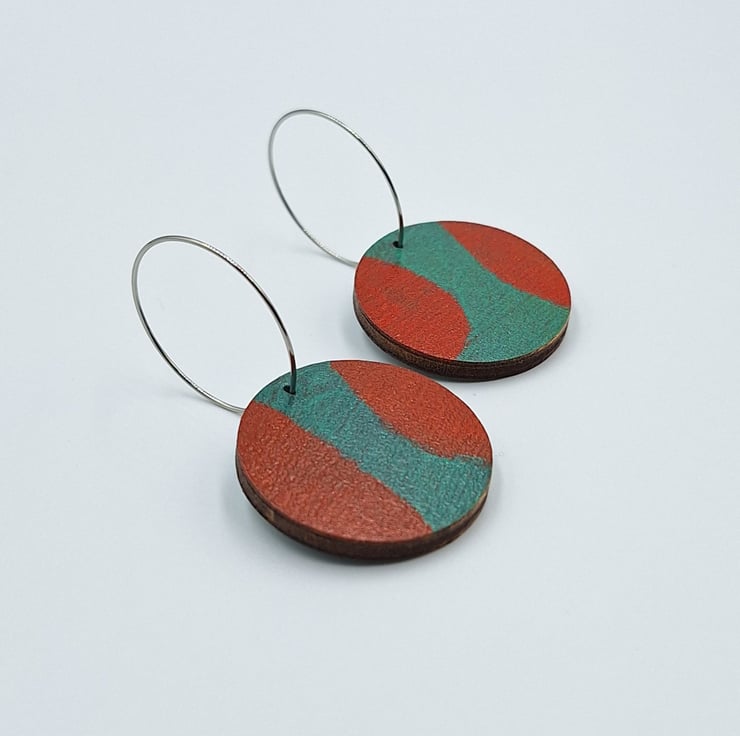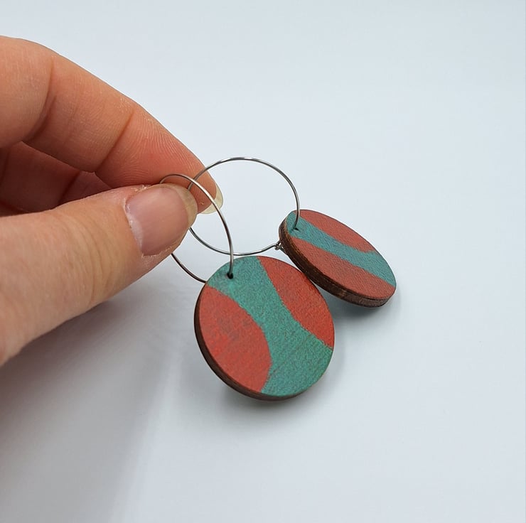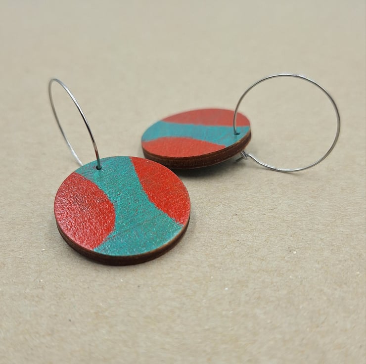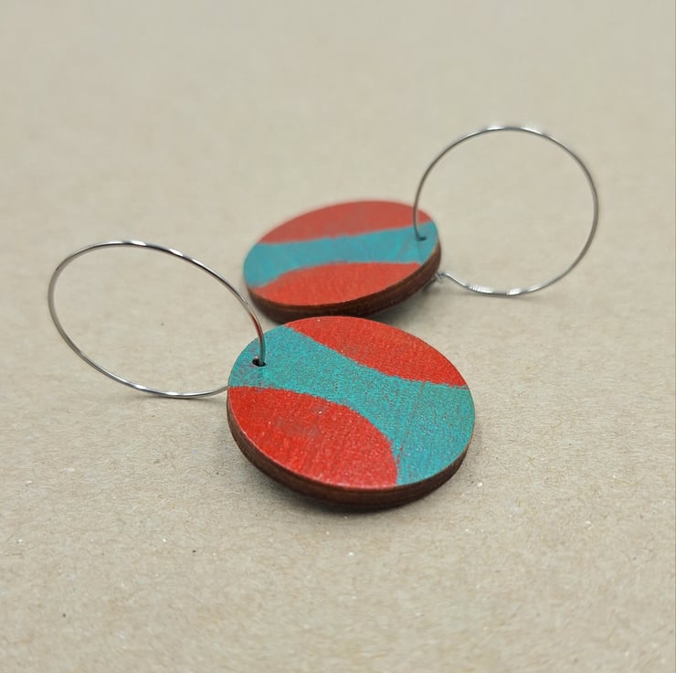 Small wooden disc hoop earrings in red and turquoise with stainless steel hoops.