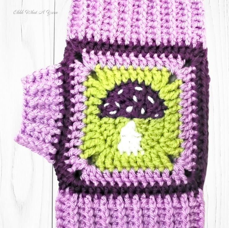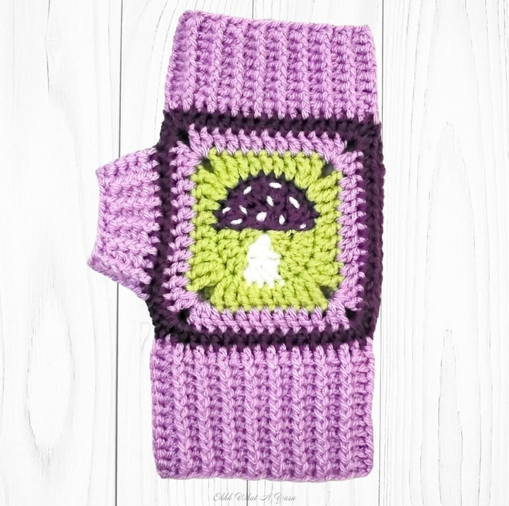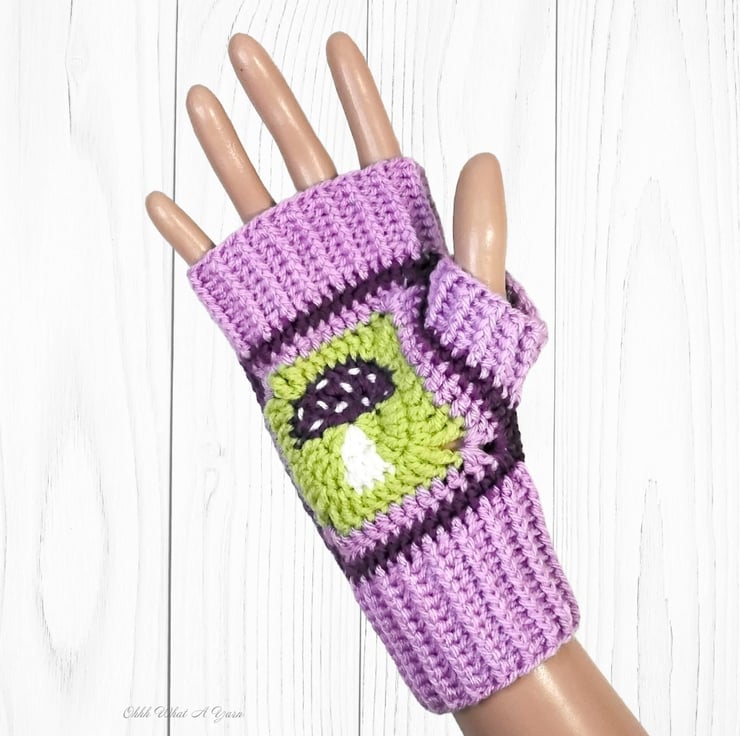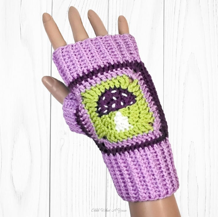 These gorgeous toadstool, mushroom shroomy fingerless gloves have been crocheted using premium 100% acrylic yarns in gorgeous shades of lilac, purple, green and cream.