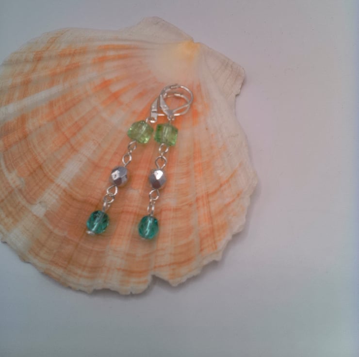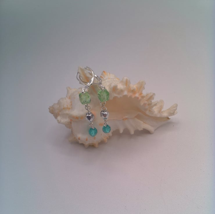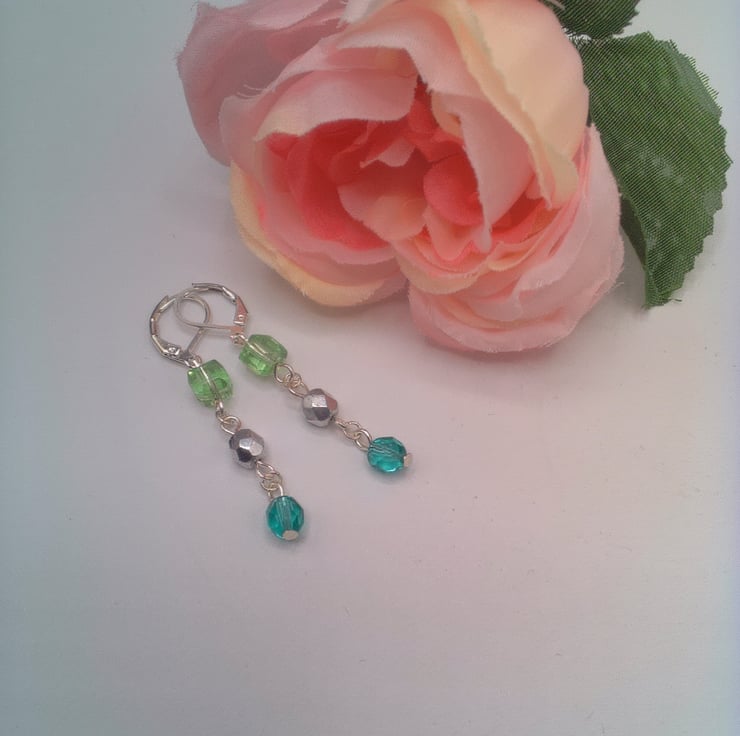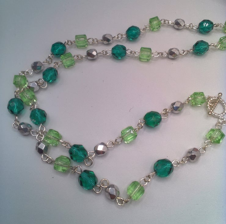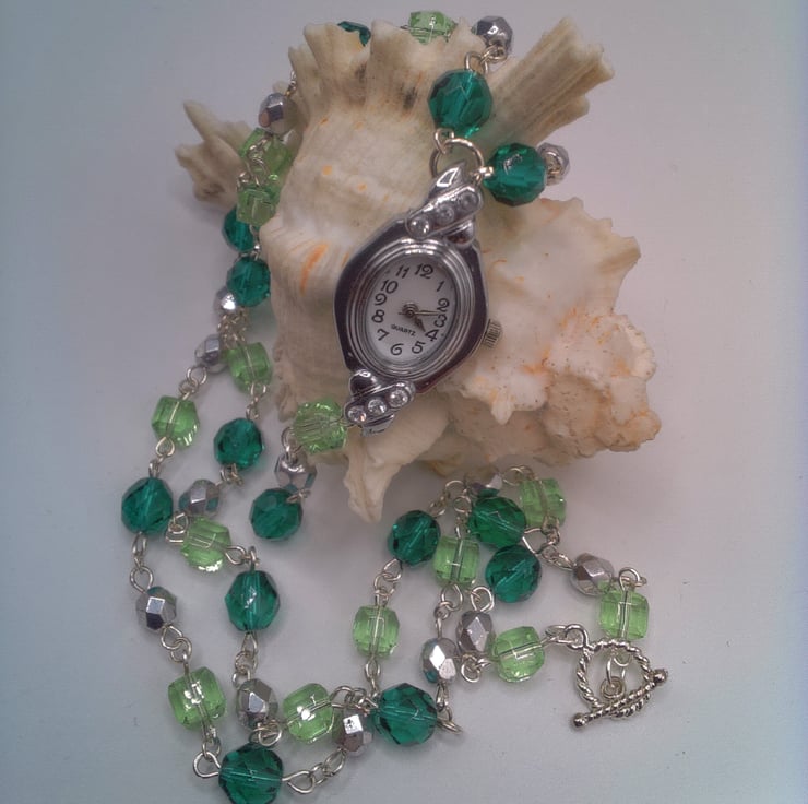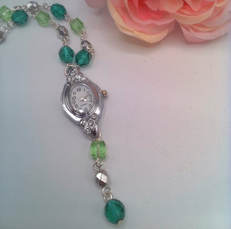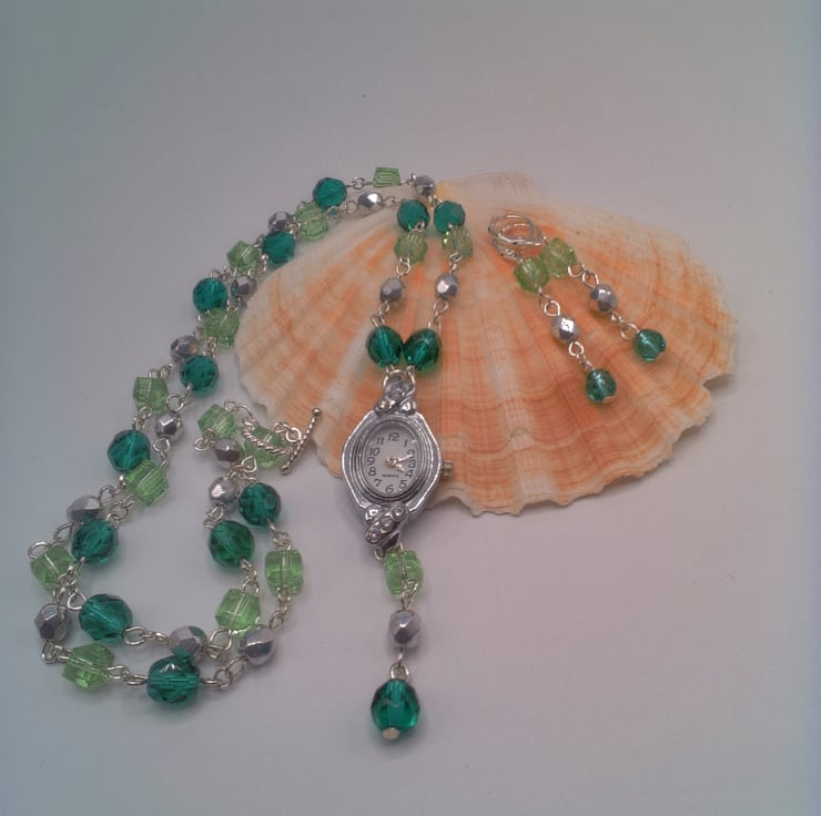 This pretty fob watch necklace and matching earrings will put the finishing touches to any outfit that you wear everyday. It would make an ideal gift for someone special or a lovely treat for yourself. The necklace is a beautiful fob watch on a 25 inch (63.5 cm) long necklace made using silver 6 mm faceted silver beads, 8 mm dark green crystal beads and 6 mm pastel green cube beads linked rosary style to form a chain. The watch hangs 2.75 inch (7 cm) from the bottom of the necklace. There is also a pair of matching earrings made with dark green, pastel green and silver beads. The earrings have a 1.5 inches (4 cm) drop from the base of the wires. The watch has a white face three small rhinestone embellishments at the top and bottom of the face. The fob watch is secured by a silver plated toggle clasp and the earrings have silver plated lever backs. The fob watch will be dispatched wrapped in tissue paper in an organza bag and delivered via Royal Mail first class post.