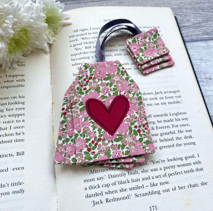 A pink & red floral tea bag bookmark, perfect for the tea drinking book lovers.