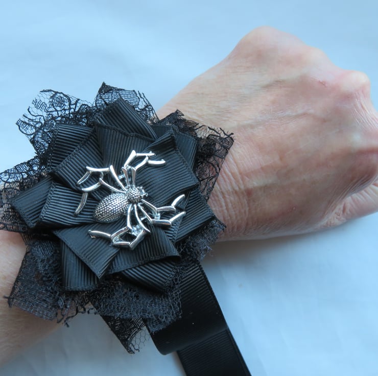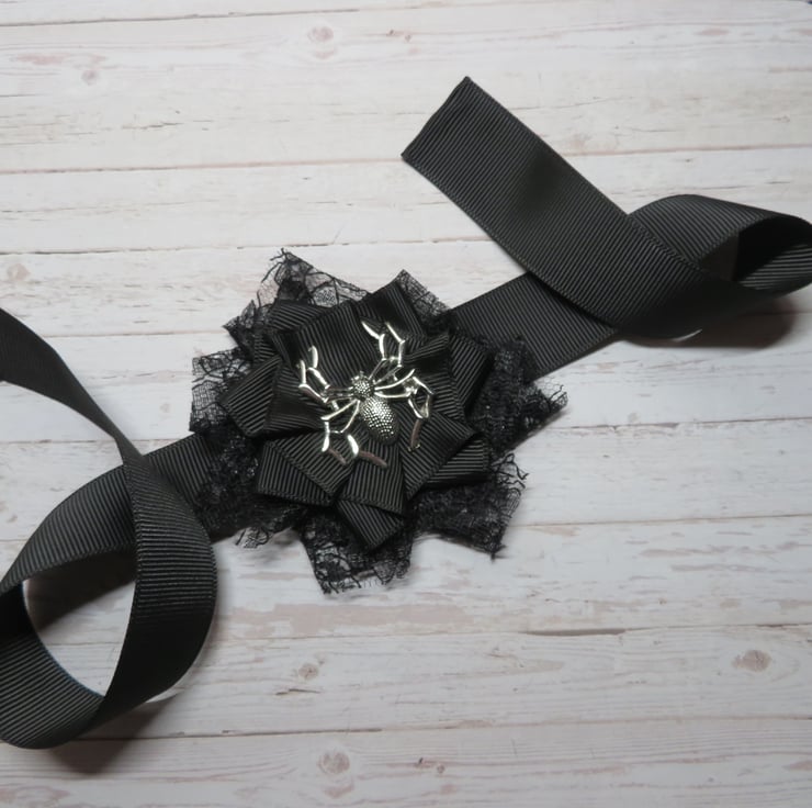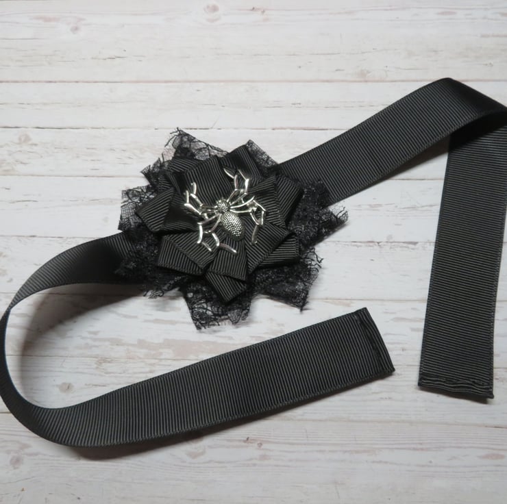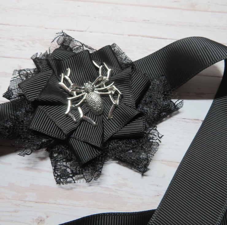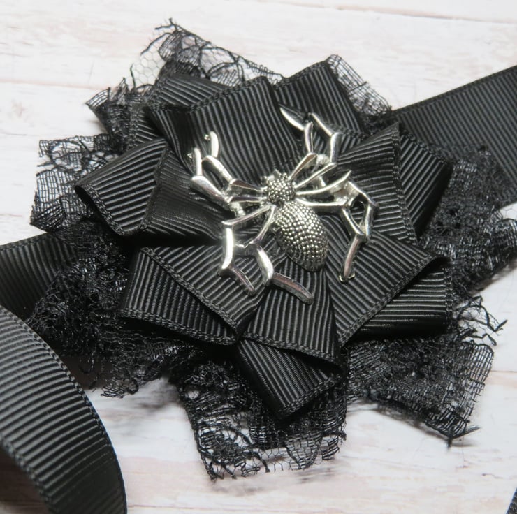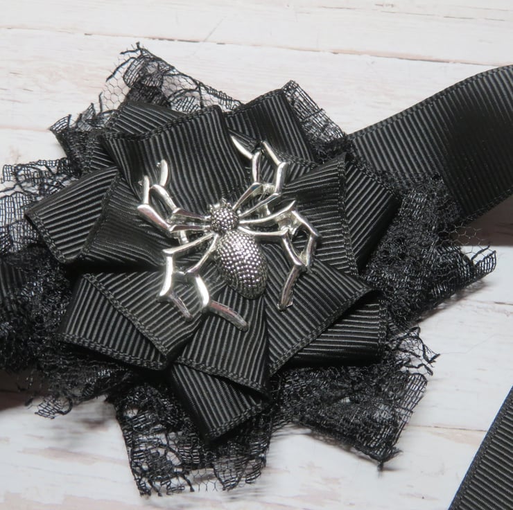 Made with a hand sewn ruffle of wide black flower lace fabric with a soft black ribbed grosgrain ruffle ribbon on top and finished with silver spider charm.
