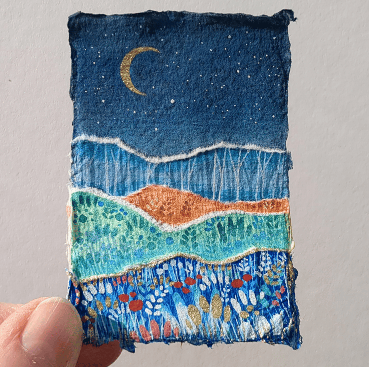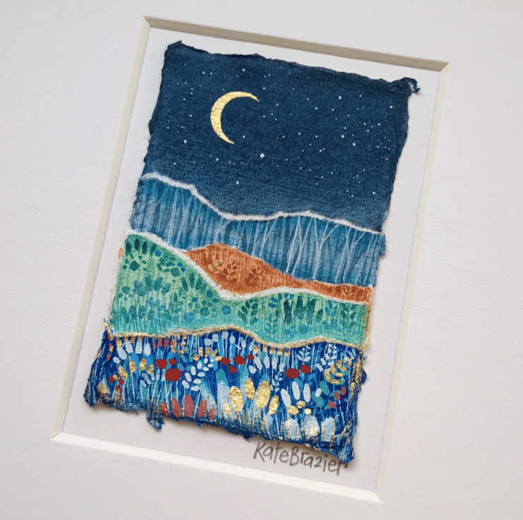 'Jewel Lights' is a tiny, mixed media collage float mounted into a custom A5 mount. It has been finished with gold details.