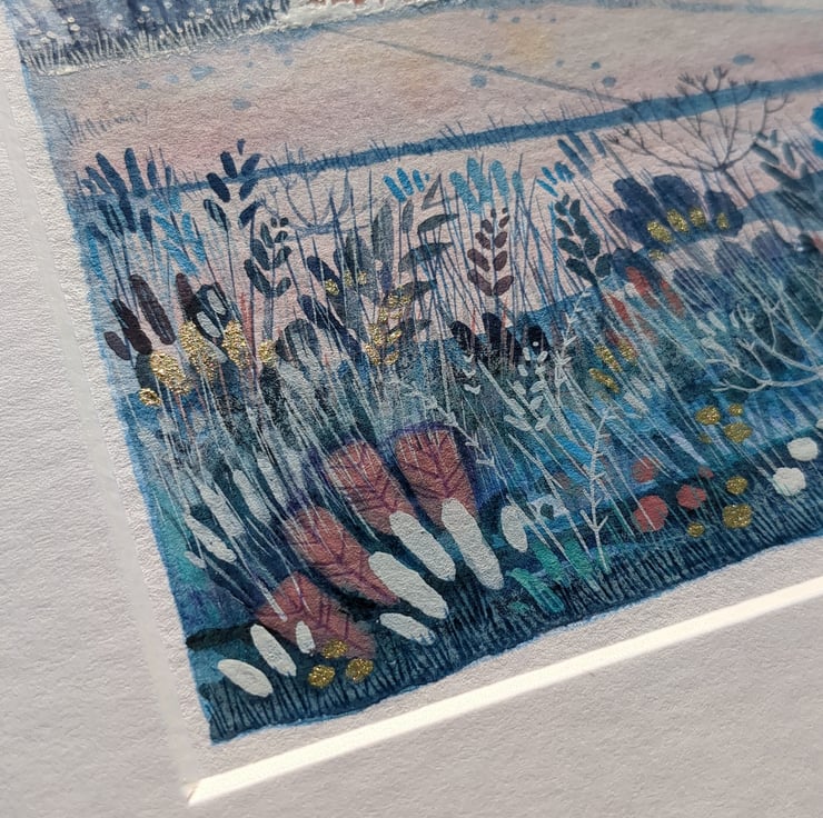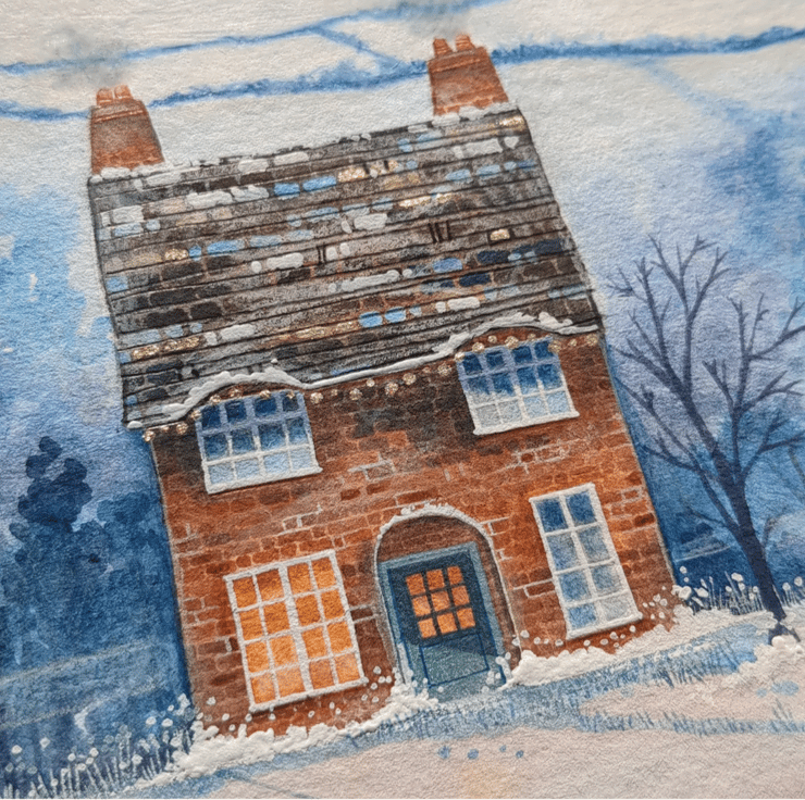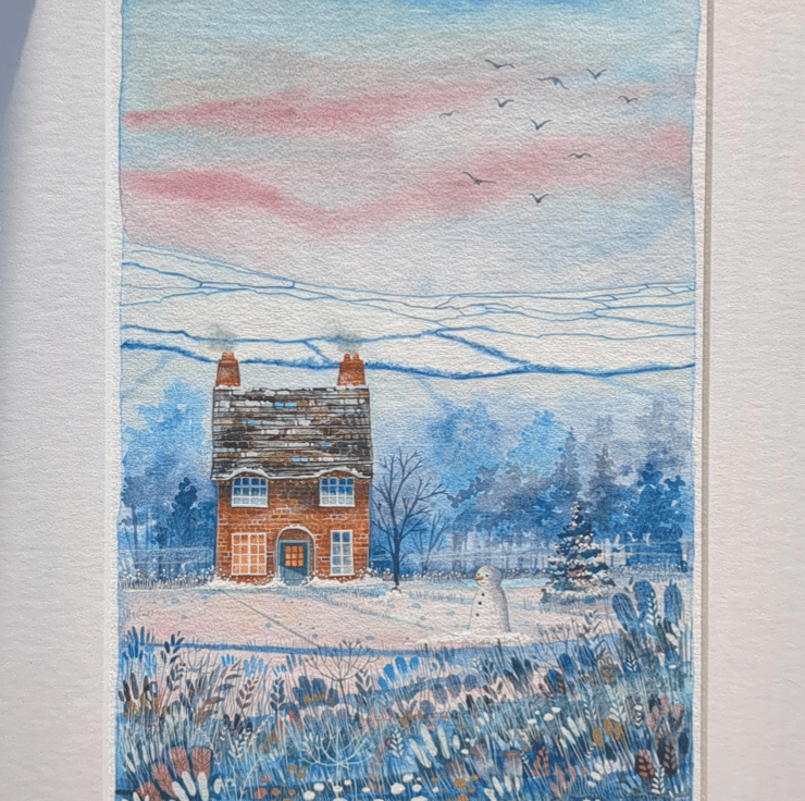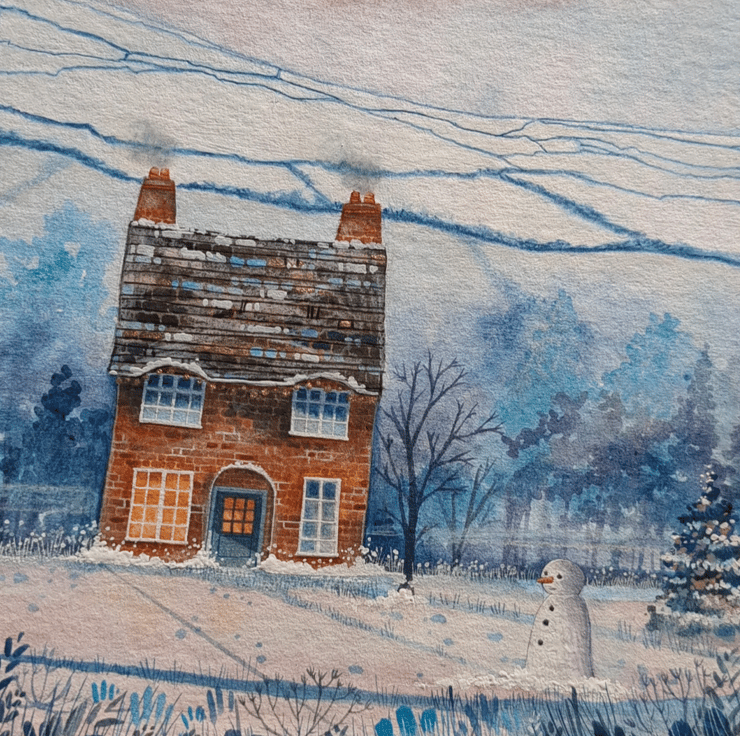 'Snowman Cottage' is a mixed media painting created using gouache paints, watercolour and Luminance pencils and painted on heavyweight Hahnemuhle watercolour paper.