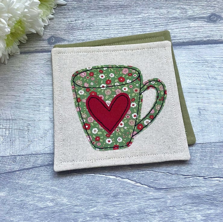 A festive green & red mug coaster, a fun gift for a tea or coffee drinker.