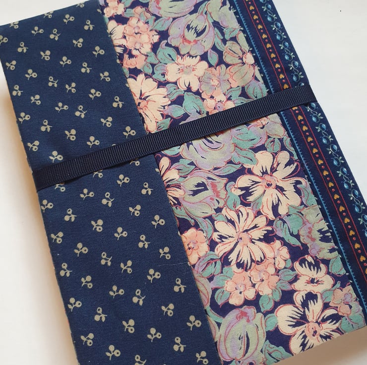 The fabrics used for these covered books include Liberty prints and other small flowery designs and the covers can be transferred to notebook of a similar size (A5) when this one is finished. These are fabrics I've salvaged or collected over many years and this particular book incorporates mostly dark blues. I have named this (1) because I am listing a second dark blue covered book which is very similar, but the fabric mix is different! Both are tied right round with wide blue ribbon.