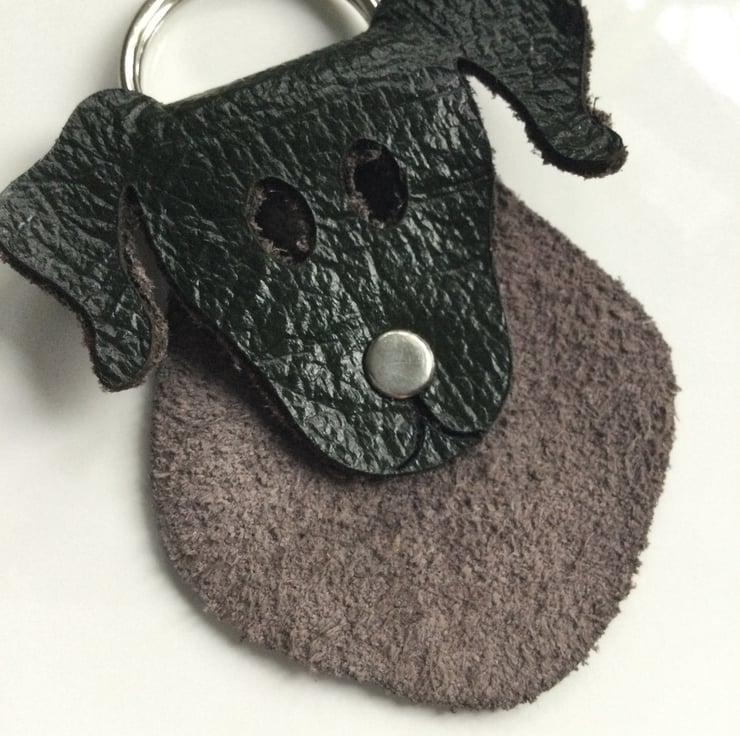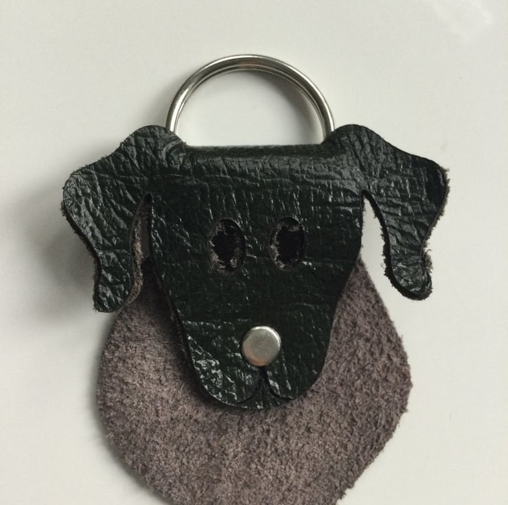 The dogs face is folded over the ring so it’s chest is in the suede contrast. A rivet acts as it’s little nose.