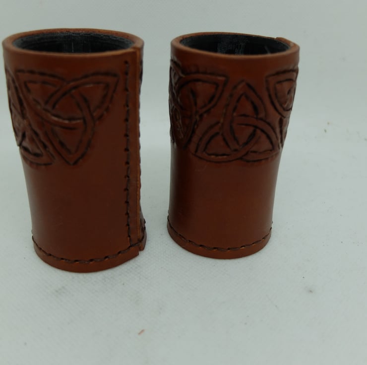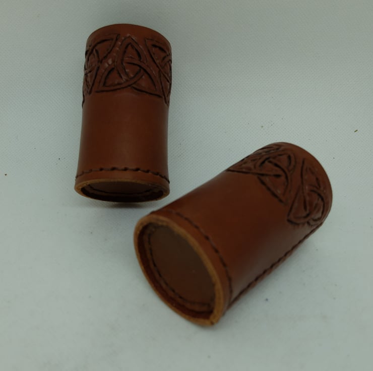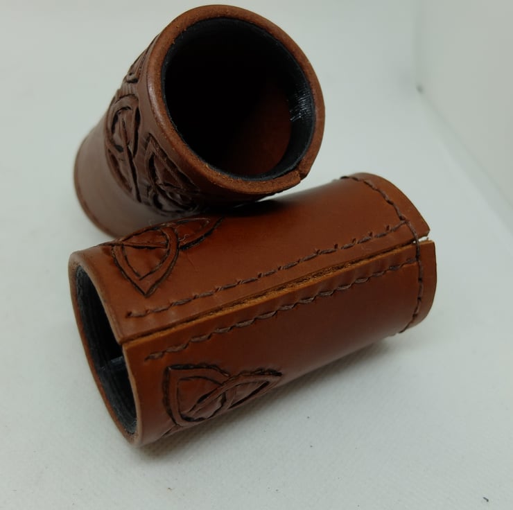 A pair of hand made dice cups in tan leather with a celtic knot design carved and tooled. Hand stitched to shape with an inner ring to aid random dice rolls.