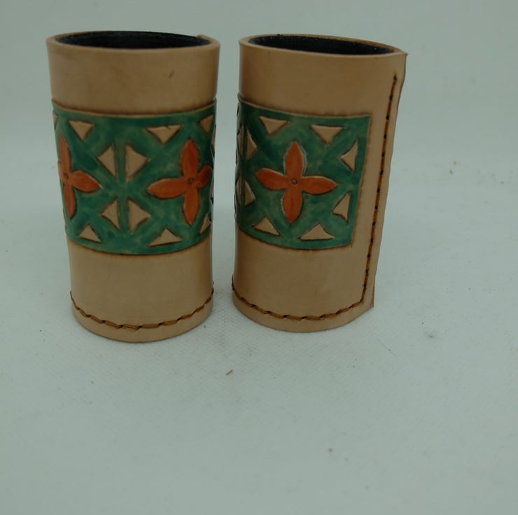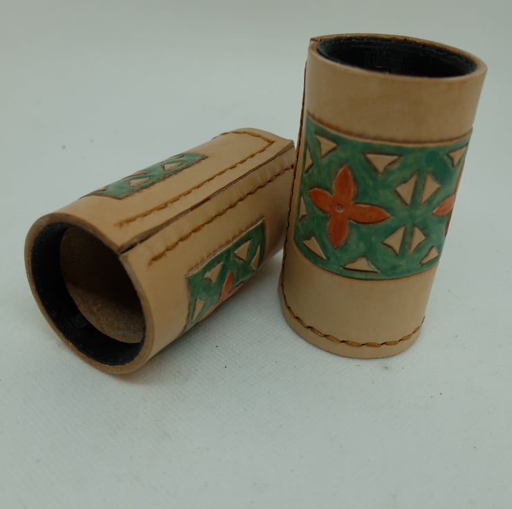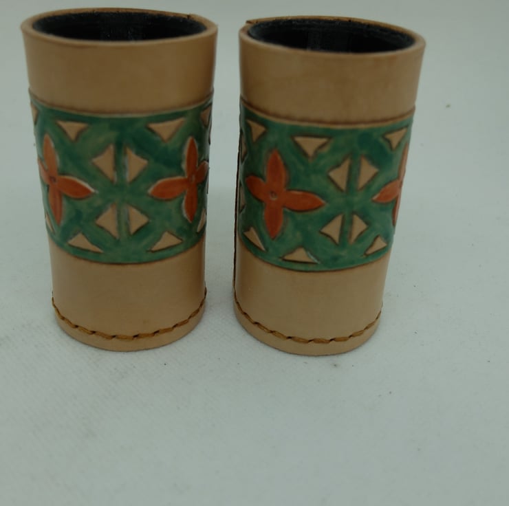 I had a play with some new leather dyes when I made these cups. Real leather, carved, tooled and dyed. Trip lip inside to aid random dice rolls. Hand stitched into shape.