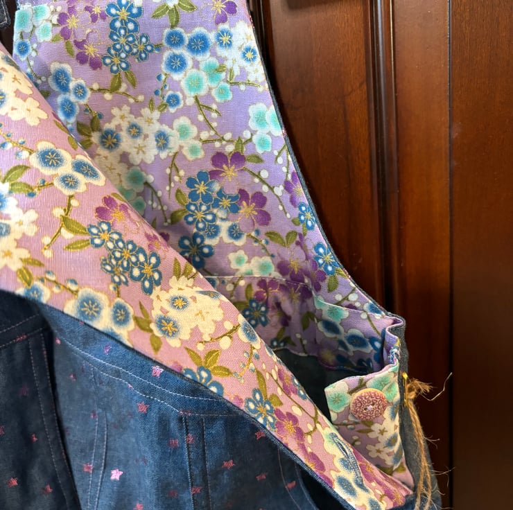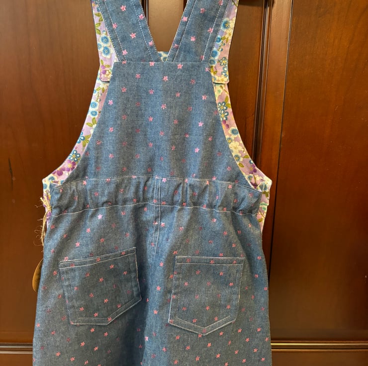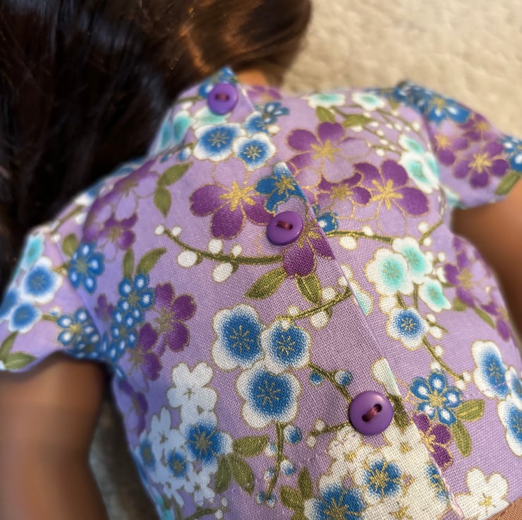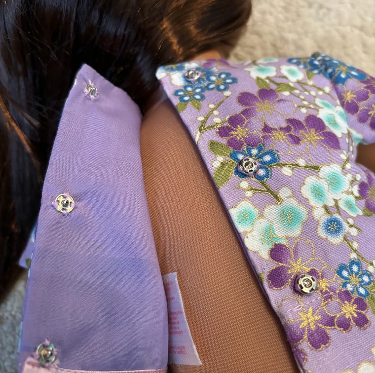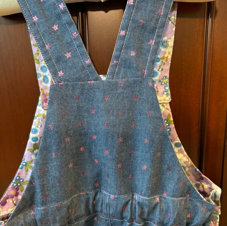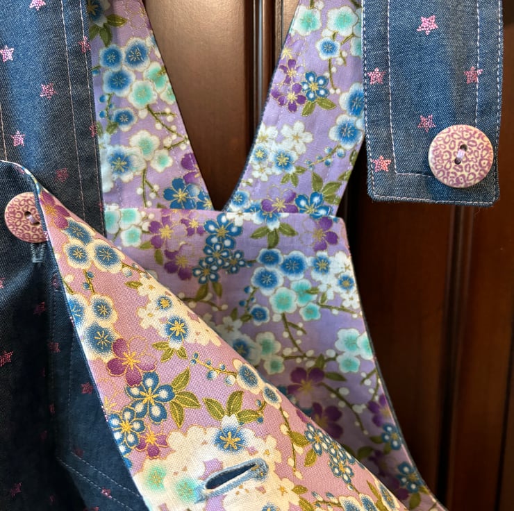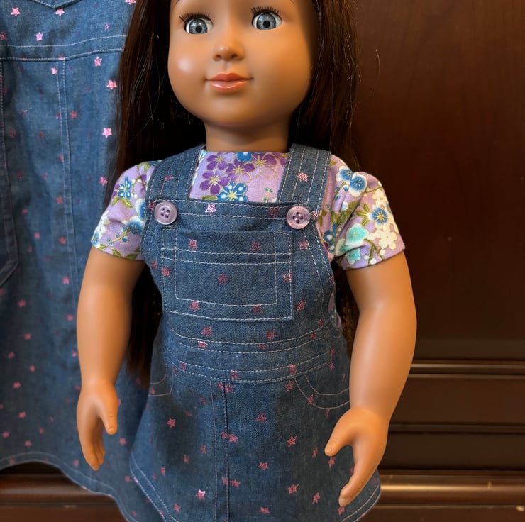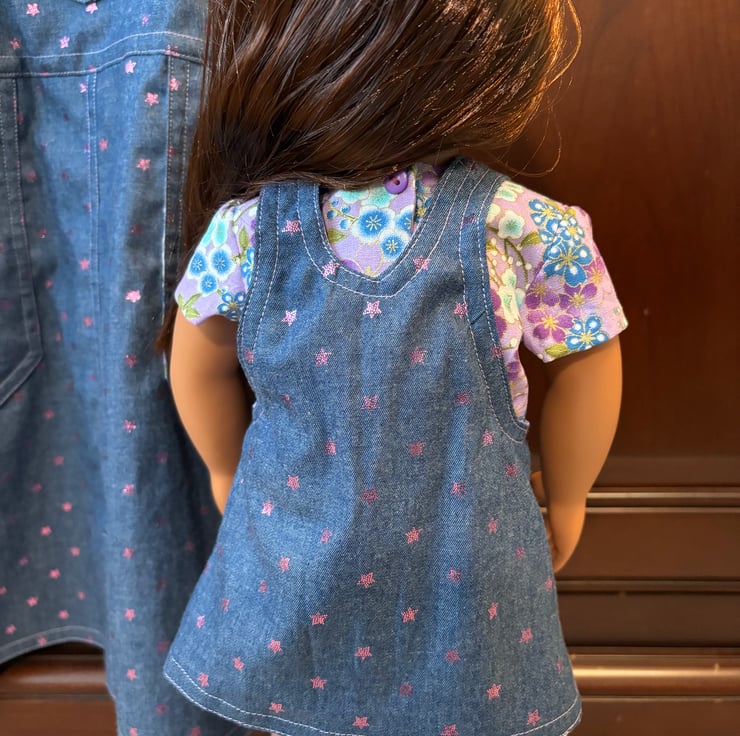 The fabric for both is a lightweight printed denim, with small foil purple stars on. The facings and the dolls top is a high quality floral print with metallic accents.
