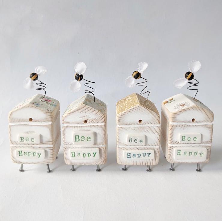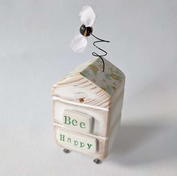 Painted white and sanded smooth the roof of the hive is adorned with flowers and the little bee dances on a bendy wire. The sign on the front reads 'Bee Happy' and is made from polymer clay which is shaped, fired and painted.
