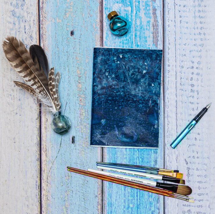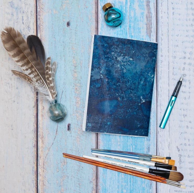 Cyanotype printing is a wonderful form of alternative photography, where you use the sun’s UV rays to develop the print. I always use flowers as the subjects for my prints, and sometimes I add some extra ingredients … for this journal, I used salt in the wet cyanotype developing process, because this gives a wonderful crystalising effect.