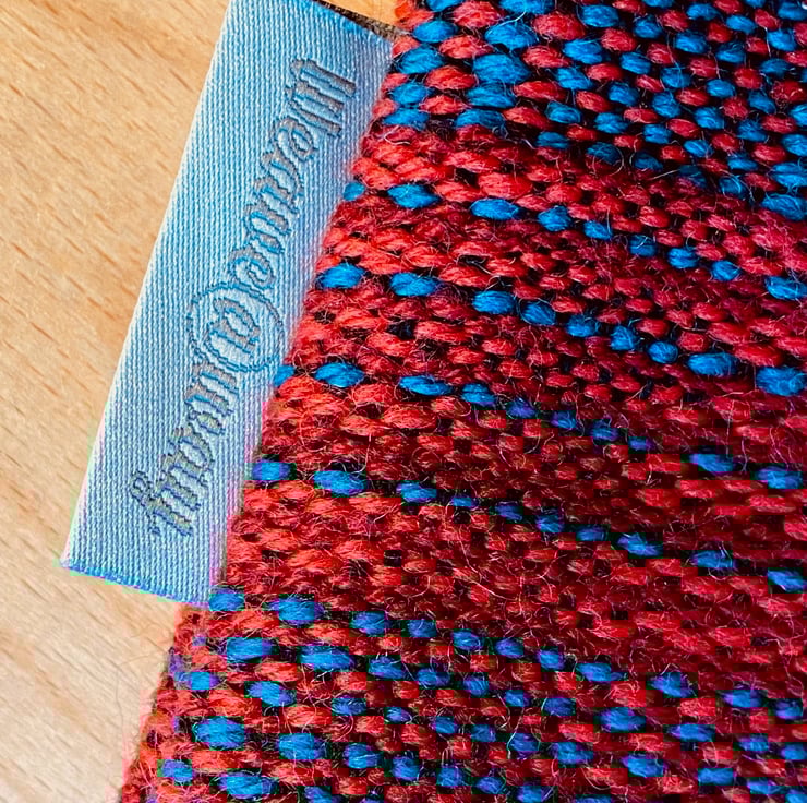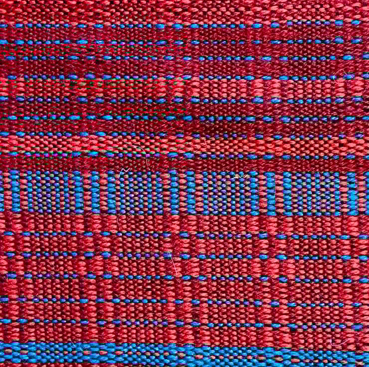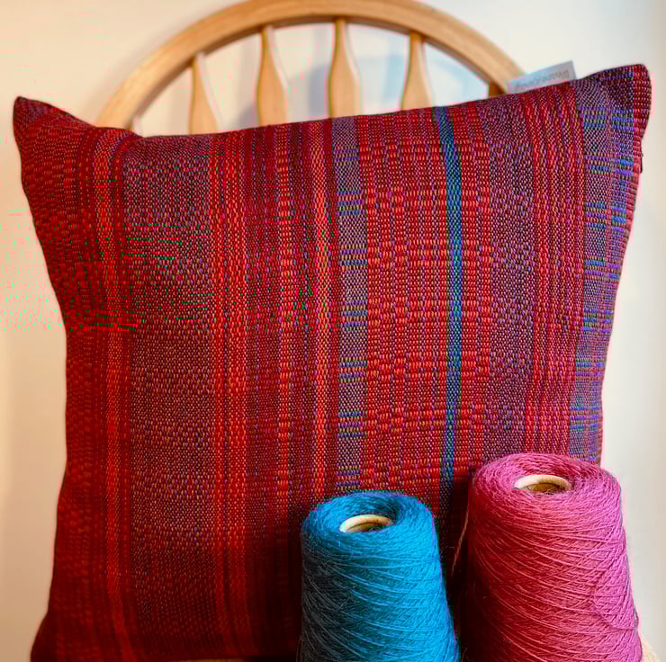 This individually hand woven 100% wool cushion, will add a pop of colour and texture to any room. Wool is warm, soft and sustainable, making it the perfect choice for any environment. Designed and made on my studio loom, in deep reds, turquoise blues and indigo, this cushion is ideal for a stylish and contemporary home interior.