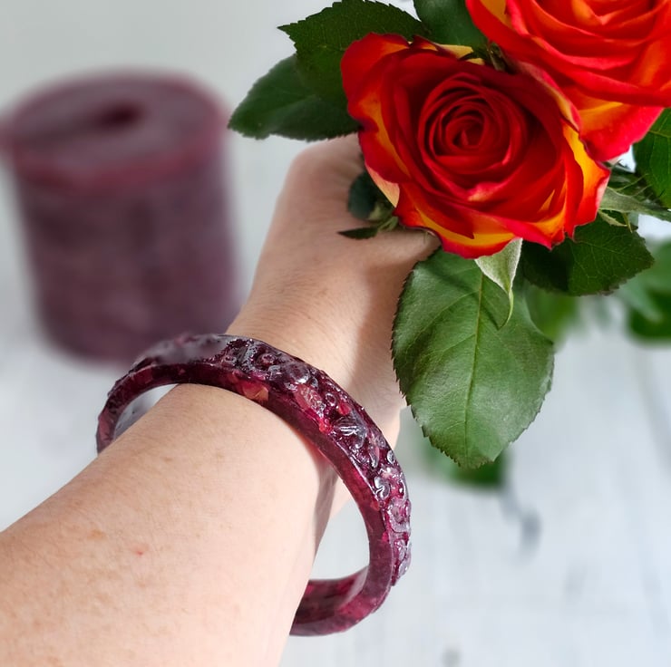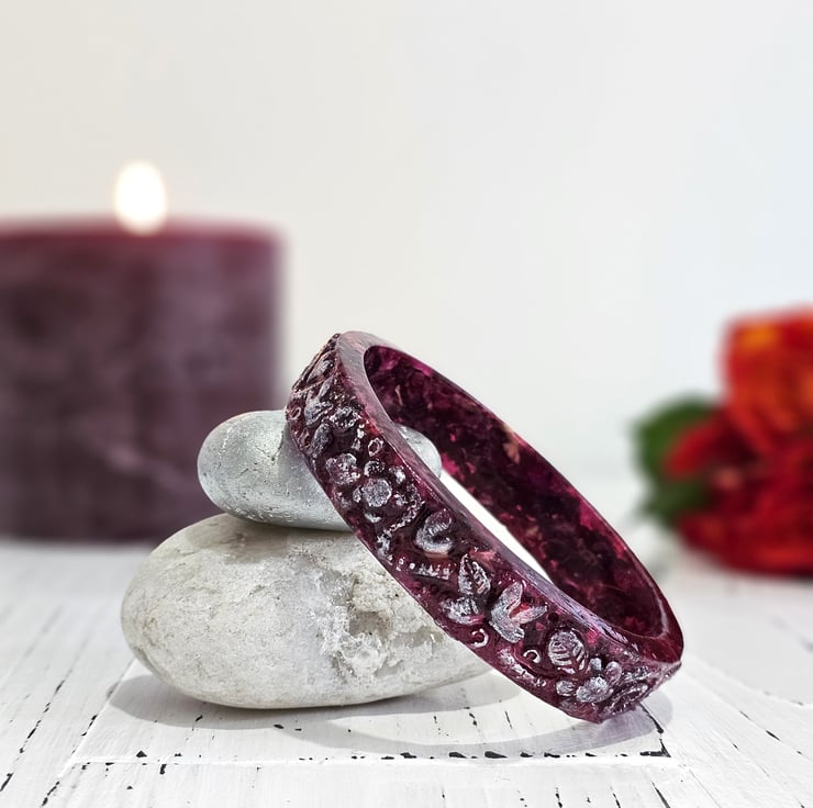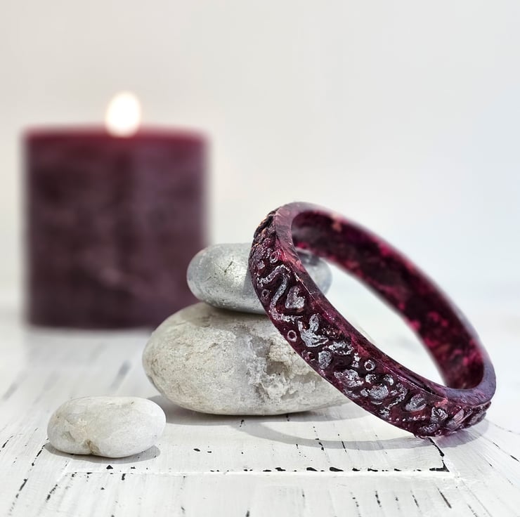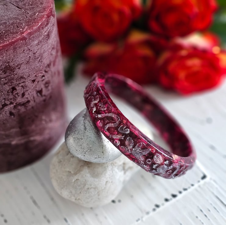 The bangle features a bespoke design that has been hanfcrafted by me, moulded and recreated in resin. This design in not available on the high street.